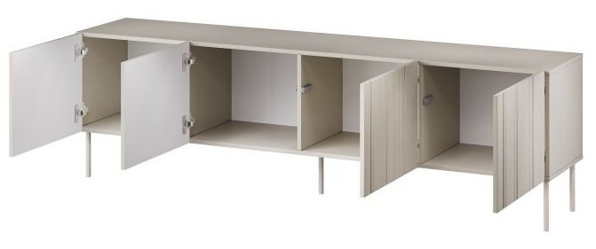 Kombinacija bež barve z mat površino MDF front ustvarja umirjen, eleganten videz, ki ne prevlada nad celotnim prostorom, temveč ga dopolnjuje. Vidni utori na frontah dodajo teksturo in razgibanost, zato komoda ne deluje monotono. Kovinske noge v enaki barvi pa skrbijo za vizualno povezanost celote. Takšna zasnova omogoča, da se kos lepo vključi v dnevne sobe, jedilnice ali celo pisarniške prostore, kjer je potrebna kombinacija estetike in uporabnosti.