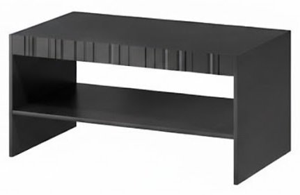 Ohišje mize je izdelano iz laminirane plošče debeline 16 mm, kar zagotavlja stabilnost in odpornost proti vsakodnevni uporabi. Sprednji del je iz MDF plošče debeline 16 mm, oplemeniten z vidnimi utori, ki dodajo teksturo in vizualno dinamiko. Kovinske noge v črni barvi so visoke 20 cm in nudijo čvrsto podporo, hkrati pa omogočajo preprosto čiščenje tal pod mizo.