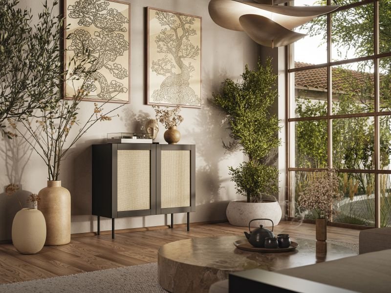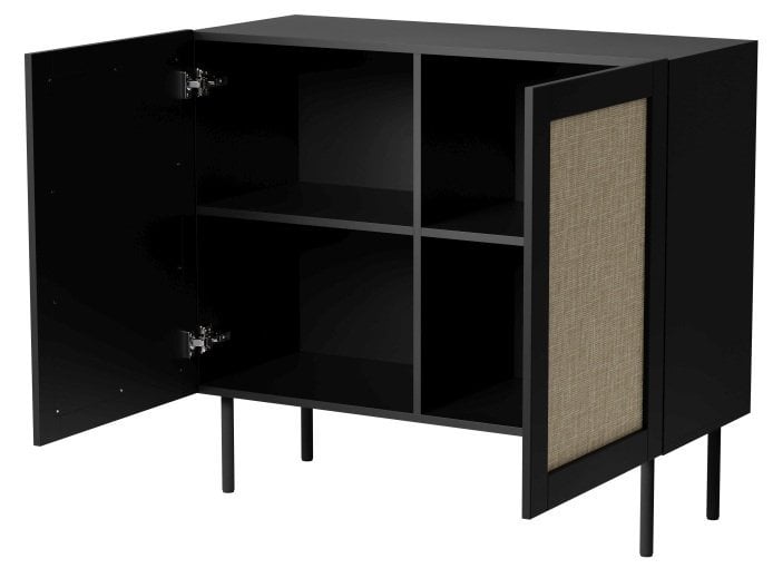 Črna barva površine daje komodi Juta eleganten in univerzalen videz. Takšna barvna zasnova omogoča enostavno kombiniranje z drugimi odtenki in materiali v prostoru – od toplih lesenih tonov do hladnih kovinskih detajlov. Črna barva poskrbi za občutek urejenosti in vizualne globine, zato se komoda lepo ujema tako z mat kot z visokosijajnimi površinami.