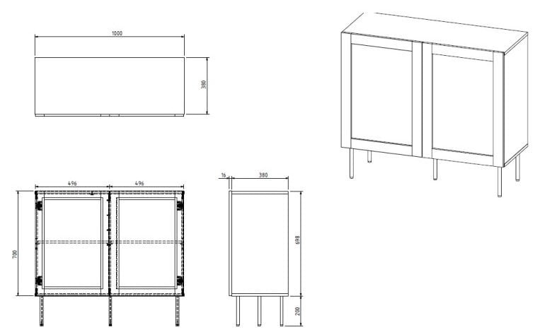 Komoda meri 100x39,5x90 cm in tehta 32 kg. Zahvaljujoč tem meram nudi dovolj prostora za shranjevanje, ne da bi vizualno preobremenila prostor. Prostornina znaša 97,68 dm³, kar omogoča shranjevanje gospodinjskih pripomočkov, tekstila, dokumentov ali dekorativnih predmetov. V notranjosti se skriva urejen prostor, ki ga je mogoče prilagoditi različnim potrebam – komodo lahko uporabite kot del večjega sestava ali samostojen element.