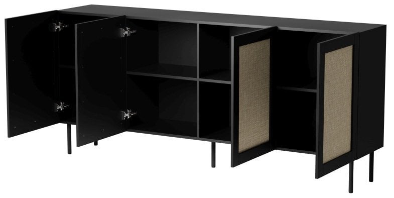 Komoda Juta 200 cm 4D ima štiri vratne fronte, ki se odpirajo s pomočjo premišljeno oblikovanih robov – fronte segajo nad zgornjo ploščo in tako nadomeščajo klasične ročaje. Ta rešitev ohranja gladko, elegantno površino in omogoča udobno odpiranje brez dodatnih elementov. Notranjost vrat ponuja dovolj prostora za organizacijo različnih predmetov, zato komoda odlično deluje kot shranjevalna enota v dnevni sobi, jedilnici ali pisarni.