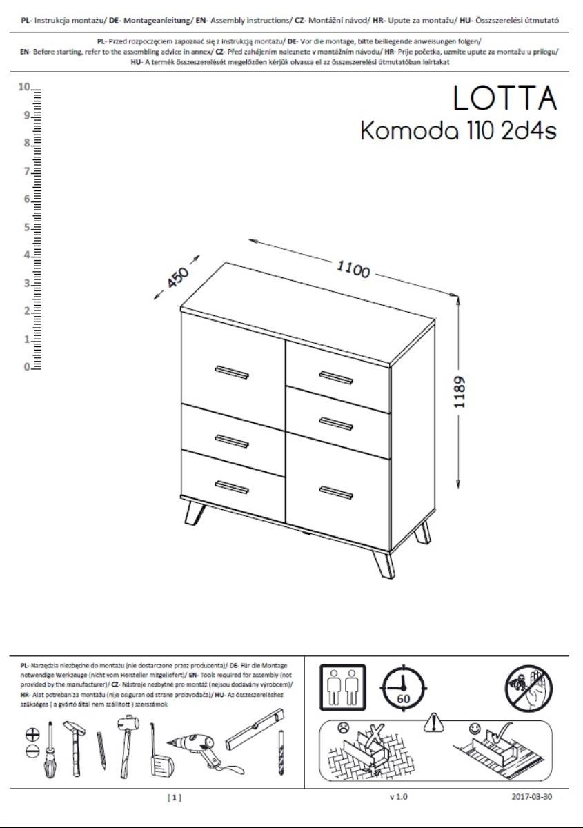Komoda meri 110 × 45 × 119 cm (širina × globina × višina), zato ponuja dovolj shranjevalnega prostora, ne da bi zavzela preveč površine v prostoru. Višina nogic znaša 15 cm, kar omogoča enostavno čiščenje tal pod pohištvom in daje komodi vizualno lahkotnost. Celoten kos je zasnovan tako, da ohranja ravnotežje med praktičnostjo in estetsko preprostostjo.