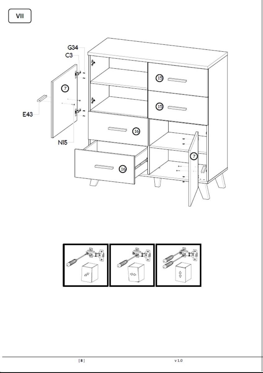 Ohišje in fronte komode so izdelane iz 16 mm debele mat ivernice, kar zagotavlja stabilnost in trajnost pri vsakodnevni uporabi. Zgornja plošča, debeline 22 mm, dodatno povečuje trdnost konstrukcije ter omogoča, da na njej varno postavite dekorativne predmete, svetila ali manjše elektronske naprave. Površina z mat premazom je prijetna na dotik, hkrati pa manj občutljiva na prstne odtise in praske.
