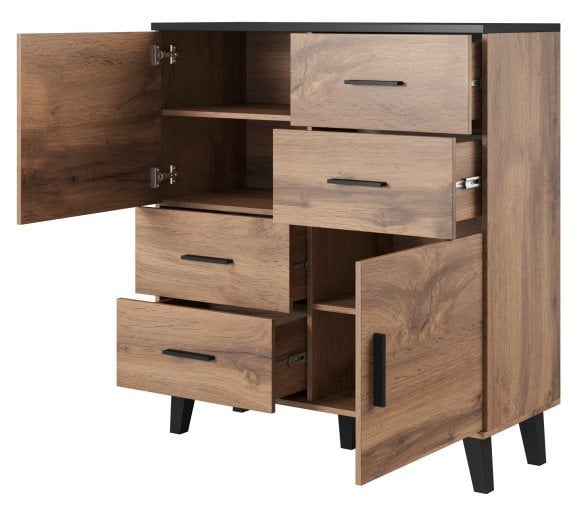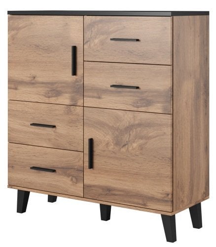 Komoda Lotta 110 cm 2D4S – Halmar združuje funkcionalnost, estetiko in kakovost izdelave. S svojo kombinacijo hrastove topline in sodobne črne barve ustvarja prijeten vizualni kontrast, ki se odlično poda k minimalističnim in skandinavskim interierjem. Zaradi premišljene višine nogic in trpežnih materialov je kos pohištva praktičen za vsakodnevno uporabo in hkrati dovolj eleganten, da poudari značaj prostora. Če iščete komodo, ki združuje trajnost, prostornost in brezčasno obliko, je model Lotta 110 cm 2D4S odlična izbira za vaš dom.