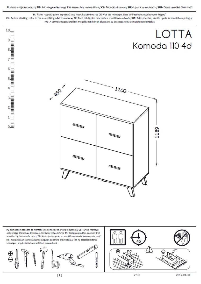 Dimenzije komode znašajo 110 × 45 × 119 cm (širina/globina/višina), kar jo uvršča med srednje velike kose pohištva, primerne za dnevne sobe, spalnice ali predsobe. Višina nog znaša 15 cm, kar omogoča enostavno čiščenje tal pod komodo in hkrati prispeva k lahkotnemu, dvignjenemu videzu. Čiste linije in uravnotežene proporcije dajejo komodi Lotta izrazito sodoben značaj, ki se lepo ujema z drugimi elementi iz kolekcije.