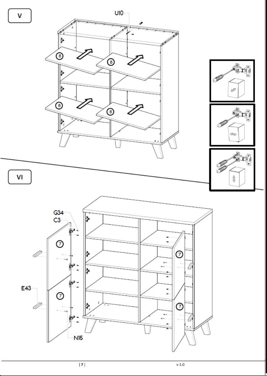 Ohišje je izdelano iz 16 mm debele mat iverne plošče, kar zagotavlja trdnost in stabilnost konstrukcije. Enaka debelina iverne plošče je uporabljena tudi za fronte vrat, kar ustvarja enoten videz in občutek kakovosti. Zgornja plošča je nekoliko debelejša – 22 mm mat iverna plošča – zato je odpornejša na obremenitve in primerna za odlaganje dekorativnih predmetov, knjig ali svetilk. Površina vseh elementov je matirana, kar zmanjšuje vidnost prstnih odtisov in poudarja naravno teksturo materiala.