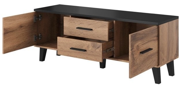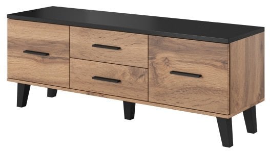 Leseno ohišje in eleganten kontrast hrasta sonoma z mat črno: TV komoda Lotta 140 cm 2D2S – Halmar.