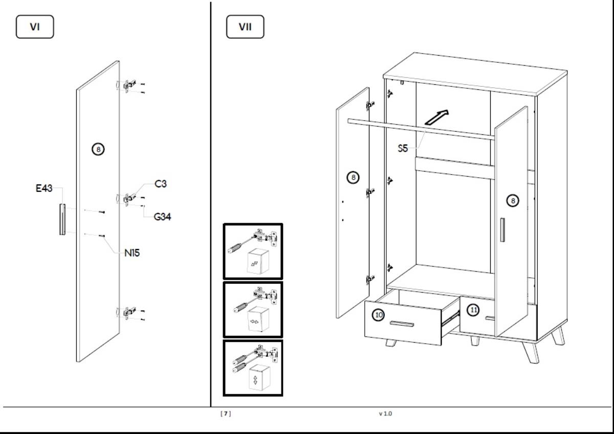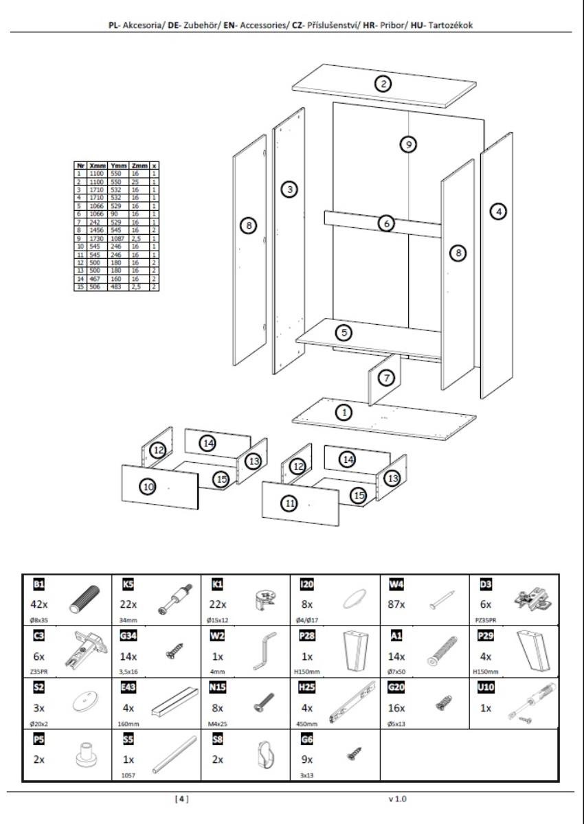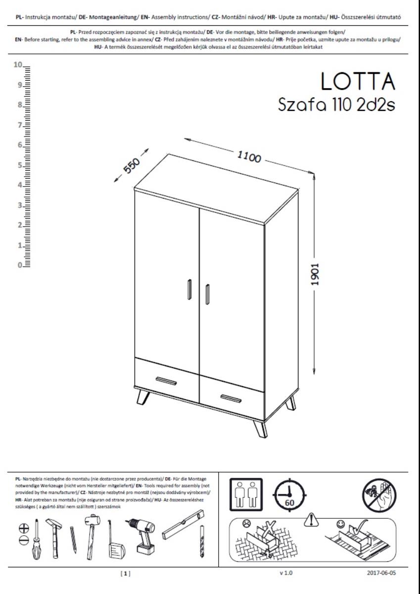 Skupne mere omare znašajo 110 × 55 × 190 cm (širina × globina × višina). Višina nogic je 15 cm, kar omogoča enostavno čiščenje tal pod omaro in ohranja zračen videz prostora. Dvoje vrat in dva priročna predala omogočata pregledno shranjevanje oblačil, dodatkov in drugih osebnih predmetov. Zaradi svoje višine omara ponuja dovolj prostora tudi za obešalnike, police ali škatle za sezonsko garderobo.