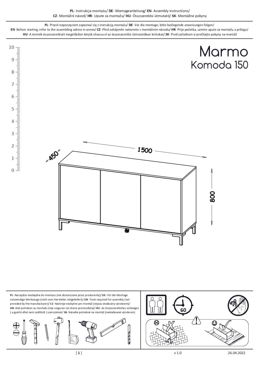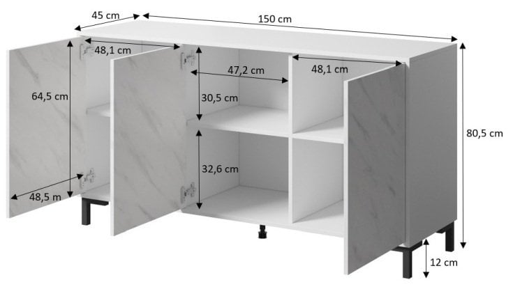 Komodo Marmo KOM150/3d lahko preprosto kombinirate z drugimi kosi iz kolekcije Marmo ali s sodobnim pohištvom podobnih linij. Zaradi svoje barvne nevtralnosti se lepo ujema z različnimi materiali – steklom, kovino ali naravnim lesom. Uporabna je kot odlagalna površina za dekoracijo, fotografije ali svetilo, hkrati pa nudi dovolj prostora za shranjevanje večjih predmetov. Njena višina 80,5 cm omogoča, da jo uporabite tudi kot dodatno površino v jedilnici ali kot komodo v predsobi za shranjevanje dodatkov in tekstila.
