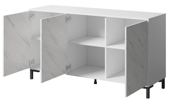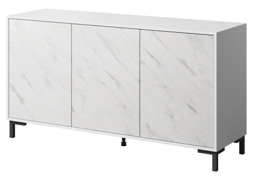Bela barva komode v kombinaciji z vzorcem imitacije marmorja deluje svetlo in zračno. Takšna površina se lepo ujame z nevtralnimi toni sten ali kontrastnimi dekorativnimi elementi, kot so leseni dodatki, črne kovinske podrobnosti ali topli tekstilni materiali. Komoda Marmo KOM150/3d se zato odlično poda v dnevno sobo, jedilnico, predsobo ali spalnico – povsod, kjer potrebujete praktičen in estetsko dovršen kos pohištva.
