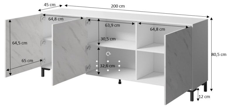 Dimenzije komode znašajo 200×45×80,5 cm, kar pomeni obilico prostora za shranjevanje. Trije prostorni deli z vrati ponujajo dovolj prostora za posodo, tekstil, dokumente ali druge predmete, ki jih želite imeti pri roki, a skrite pred pogledi. Zaradi svoje širine komoda odlično dopolnjuje daljše stene dnevne sobe ali jedilnice, hkrati pa se zaradi uravnotežene višine lahko uporablja tudi kot podstavek za dekorativne elemente, televizor ali ogledalo.