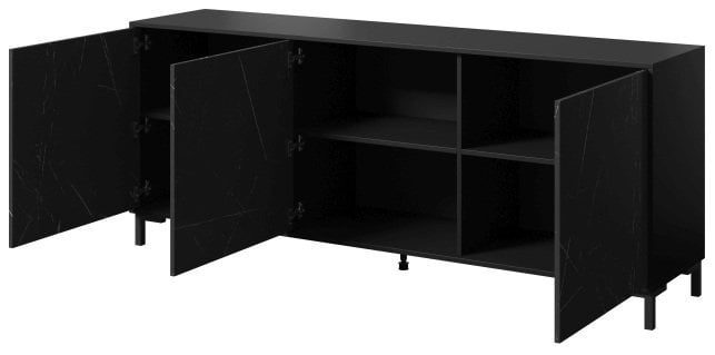 Črna površina z marmoriranim vzorcem ustvarja vtis luksuza in elegance. Imitacija marmorja doda pridih naravnega kamna, ne da bi pri tem povečala težo ali zahtevnost vzdrževanja. Mat zaključek poudari sodobni značaj komode in preprečuje odseve svetlobe, zato je primerna tako za svetle kot temnejše prostore. Kombinacija barve in teksture omogoča enostavno usklajevanje z drugimi kosi pohištva ali dodatki v kovinskih, lesenih ali steklenih tonih.