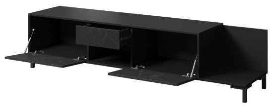TV komoda Marmo RTV2D1S1K je zasnovana za uporabnike, ki želijo ohraniti urejen in estetsko dovršen dnevni prostor. Zaradi svoje dolžine omogoča postavitev večjih televizorjev, medtem ko notranji predali in omarice zagotavljajo dovolj prostora za multimedijsko opremo, daljince, kablovje ali zbirko filmov. Odprta polica je praktična za naprave, ki zahtevajo prost pretok zraka ali neposreden dostop do signalov daljinskega upravljanja.