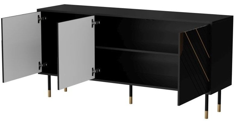 Noge so kovinske, v kombinaciji črne in zlate barve, s višino 18 cm. Takšna zasnova omogoča lažje čiščenje prostora pod komodo in dodatno prispeva k stabilnosti. Sistem odpiranja PUSH TO OPEN omogoča preprosto in tiho odpiranje vrat brez ročajev, kar ohranja čist videz front.