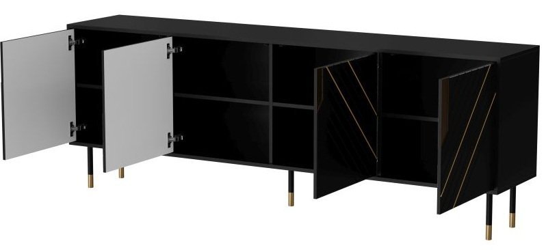 Komoda Mountain 200 cm 4D – Halmar je odlična izbira za vse, ki iščejo preplet sodobnega dizajna, praktičnosti in kakovostne izdelave. S svojo preprosto, a izrazito estetiko dopolnjuje tako moderne kot klasične prostore in omogoča, da vaš dom zasije v elegantni črno-zlati kombinaciji.