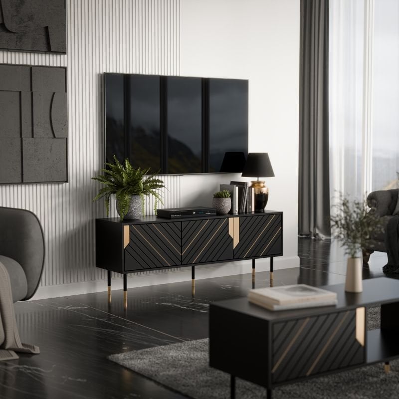 TV komoda Mountain 150 cm 3D znamke Halmar združuje sodoben dizajn, kakovostne materiale in funkcionalnost, ki ustreza zahtevam sodobnega doma. S svojimi dimenzijami 154x40x55 cm ponuja dovolj prostora za televizor ter dodatne multimedijske naprave, hkrati pa s prefinjenimi detajli v črno-zlati barvni kombinaciji v prostoru ustvari pridih razkošja. Gre za kos pohištva, ki se odlično poda v moderne dnevne sobe, kjer prevladujejo čiste linije in kontrasti materialov.