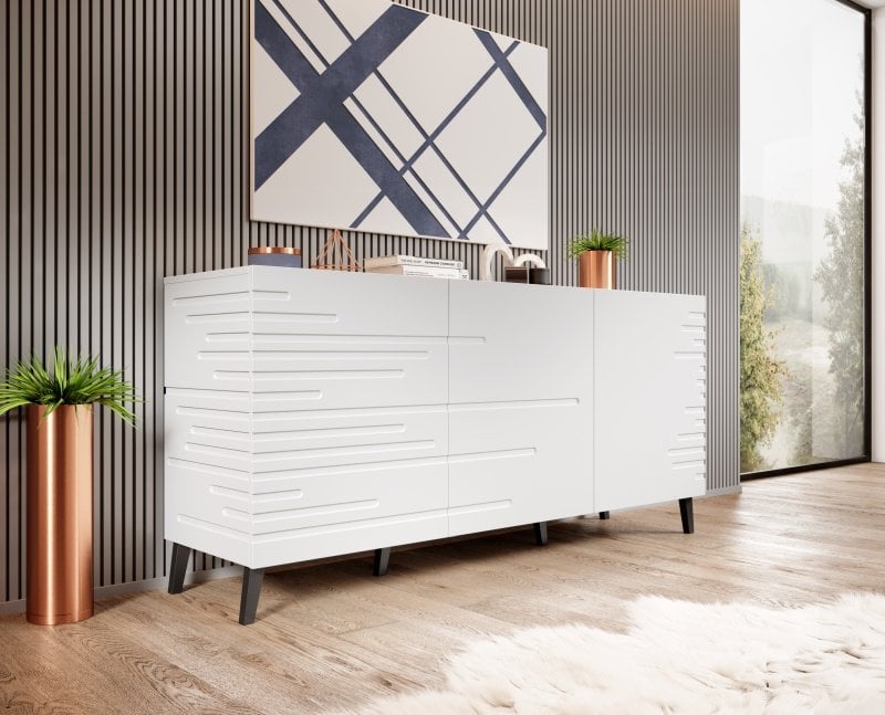 Bela mat barva je osrednji estetski element te komode. Zaradi svoje nevtralnosti se lepo ujema z različnimi materiali in barvami – od svetlega lesa do temnih kovinskih elementov. Bela površina vizualno poveča prostor in se odlično zlije z modernimi, skandinavskimi ali minimalističnimi interierji. Mat zaključek preprečuje bleščanje in poudarja naravno teksturo materiala.