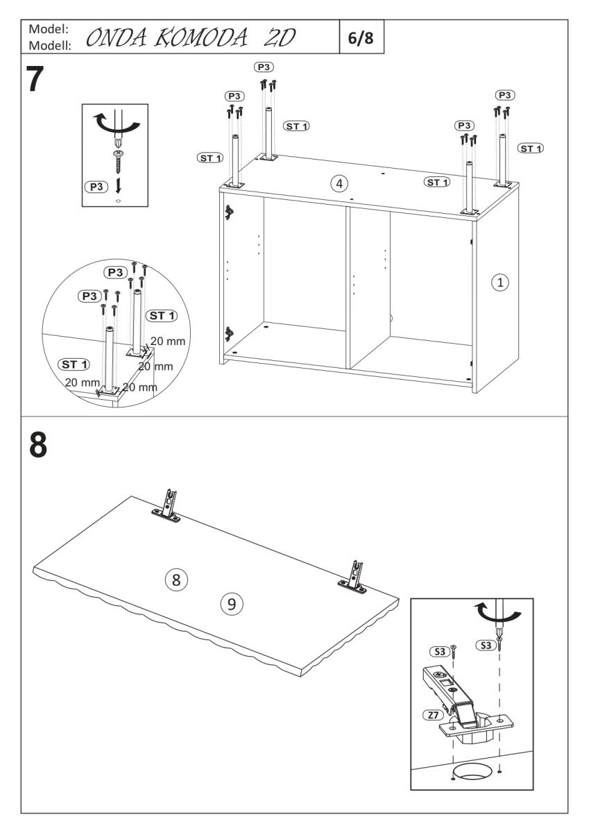 Komoda stoji na štirih kovinskih nogah v črni barvi, višine 200 mm in premera 20 mm. Kovinske noge zagotavljajo čvrsto oporo, stabilnost ter olajšajo čiščenje tal pod pohištvom. Zaradi višine nog komoda deluje vizualno lahkotno, hkrati pa omogoča, da prostor pod njo ostane zračen in dostopen.