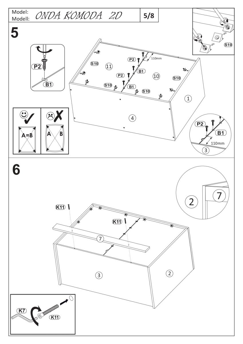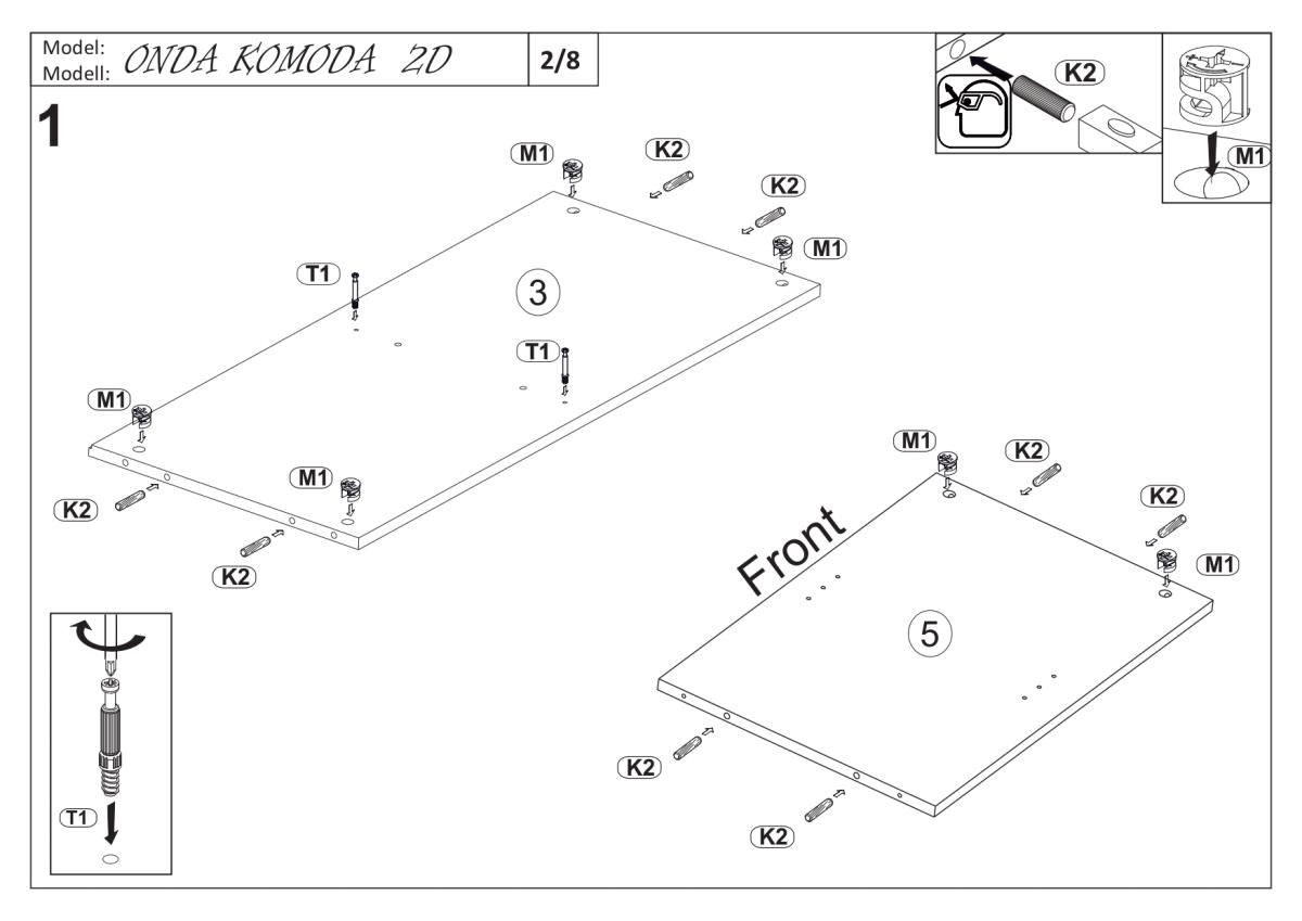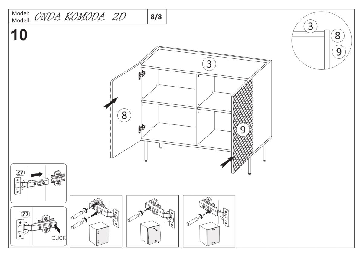 Komoda Onda 2D ima dve prostorni omarici, ki se odpirata z vrati, opremljenimi s kakovostnimi kovinskimi tečaji s sistemom tihega zapiranja. Ta mehanizem omogoča nežno in neslišno zapiranje vrat, kar povečuje udobje uporabe in preprečuje poškodbe občasnega zaloputovanja.
