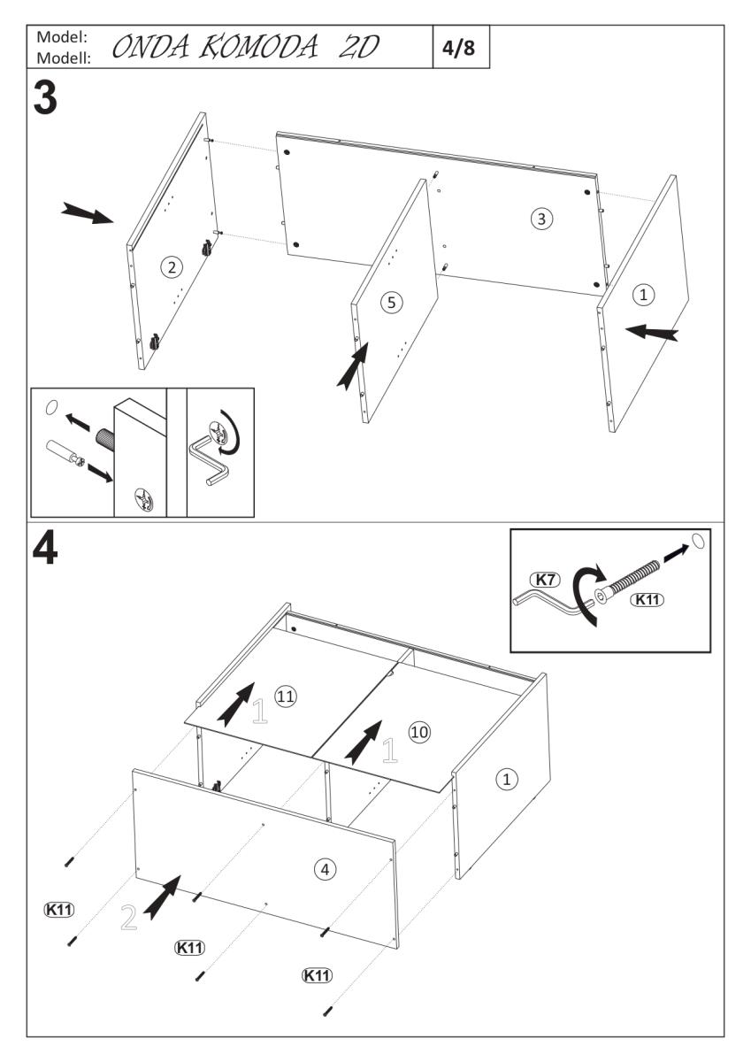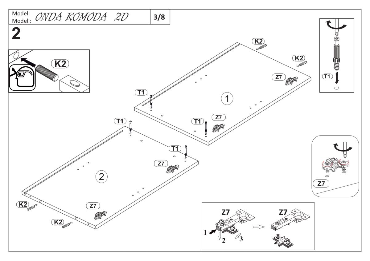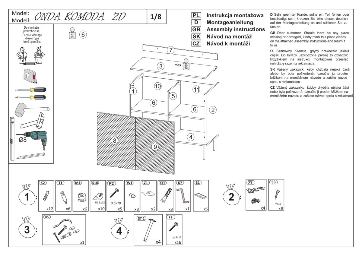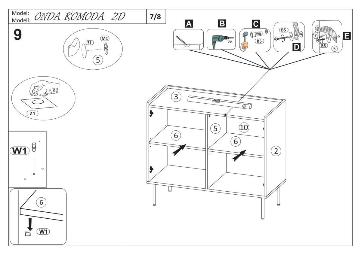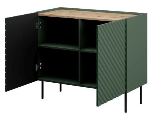 Komoda Onda 2D vključuje dve prostorni omarici z vrati, ki ju odlikujejo kovinski tečaji s tihim zapiranjem. Ta sistem omogoča nežno in tiho zapiranje vrat, kar poveča udobje vsakodnevne uporabe ter preprečuje obrabo materialov. Notranjost ponuja dovolj prostora za shranjevanje perila, dokumentov, posode ali drugih gospodinjskih predmetov, zato je komoda primerna za različne prostore in namene.