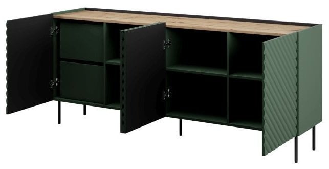 Komoda Onda 4D2SZ je izraz sodobne estetike in praktične zasnove, ki jo odlikuje uravnotežena kombinacija temno zelene barve z detajli v črni mat izvedbi. S svojimi dimenzijami 200x45x85 cm ponuja prostorno shranjevanje in hkrati izžareva eleganco, ki dopolnjuje vsak interier – od minimalističnih prostorov do bogateje opremljenih dnevnih sob. Izdelana je v priznani tovarni Halmar na Poljskem, kjer združujejo kakovostne materiale in natančno obdelavo.