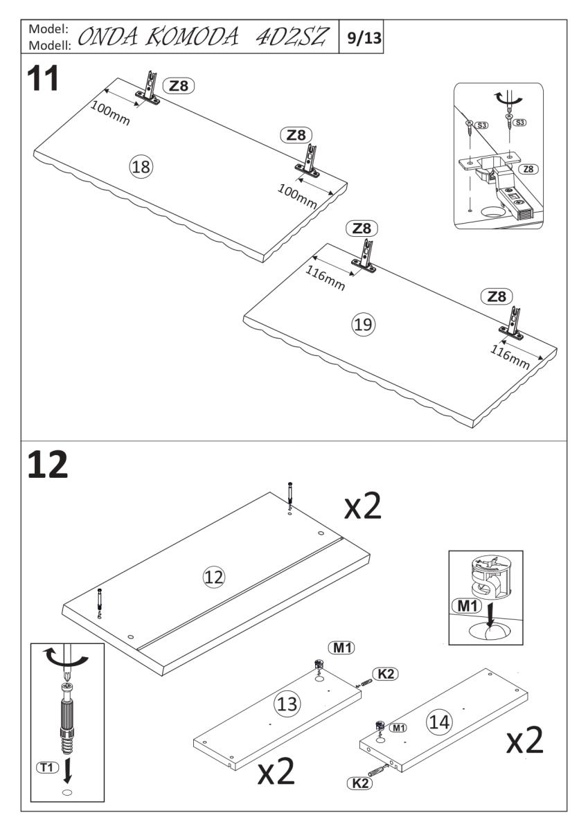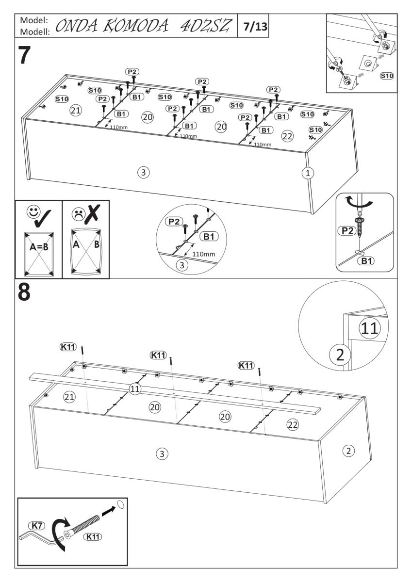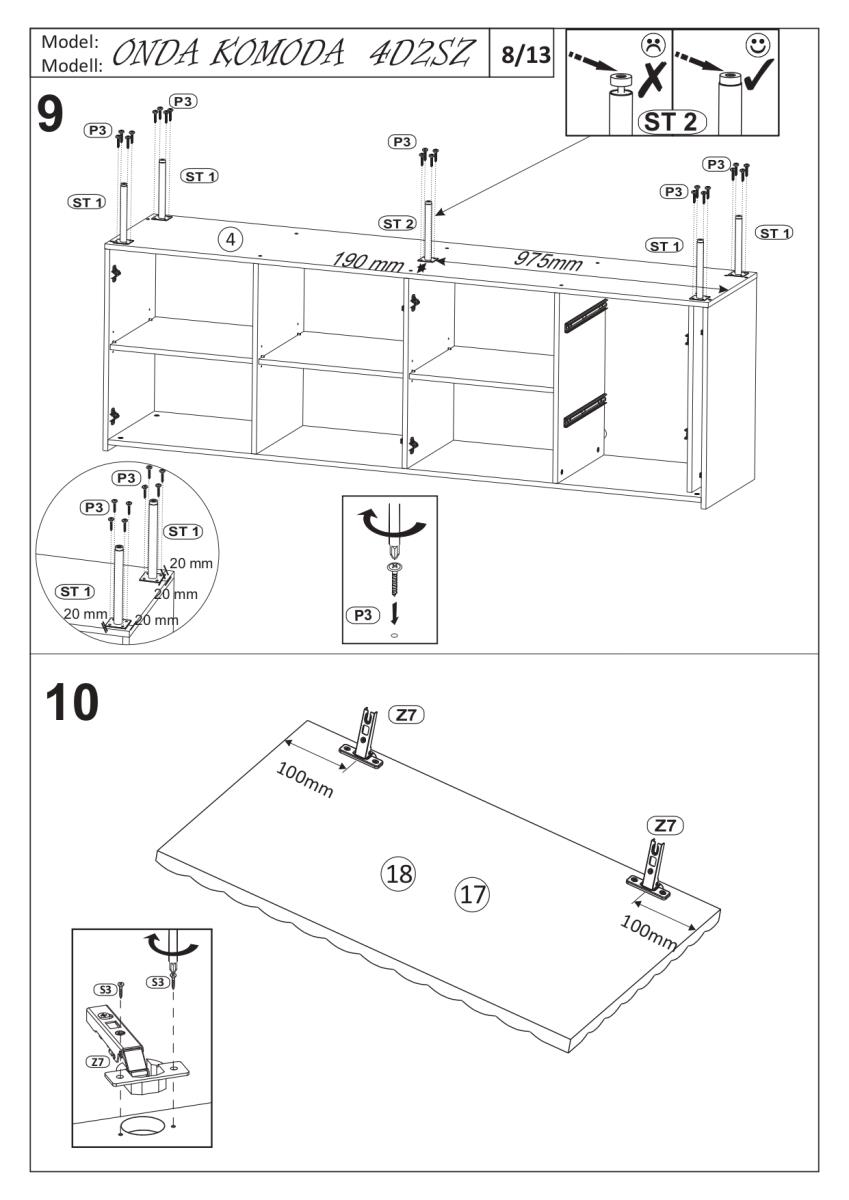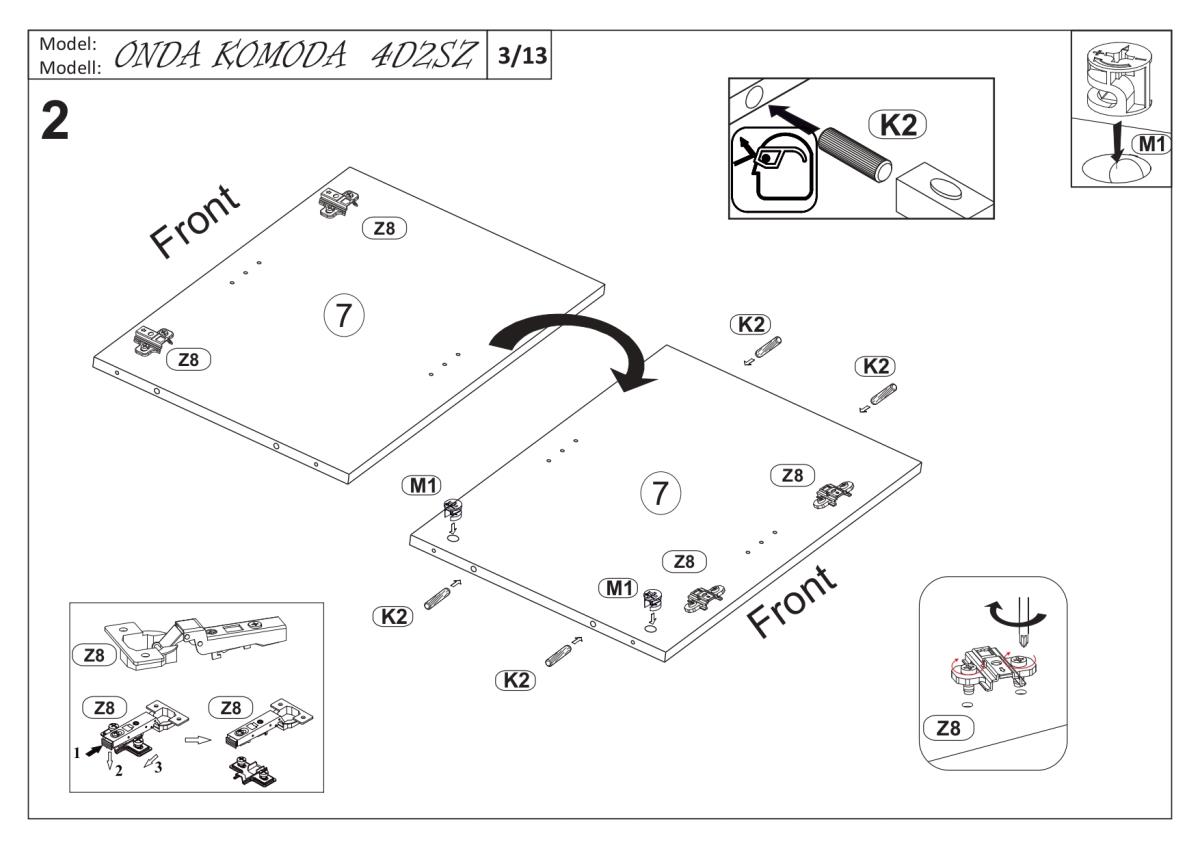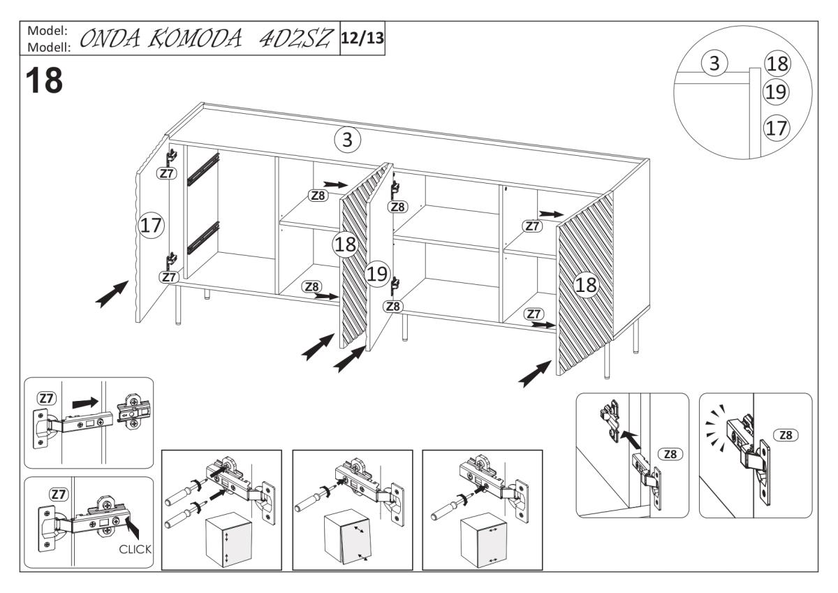 Komoda Onda 4D2SZ vključuje štiri vrata in dva priročna predala, ki ponujata dovolj prostora za shranjevanje različnih predmetov – od posode in tekstila do dokumentov ali dekorativnih elementov. Mehko zapiranje tečajev omogoča tiho in nežno zapiranje vrat, kar povečuje udobje uporabe ter preprečuje obrabo tečajev skozi čas. Fronte, ki se rahlo dvigajo nad zgornjo ploščo, nadomeščajo klasične ročaje in ustvarjajo čisto linijo brez nepotrebnih dodatkov.