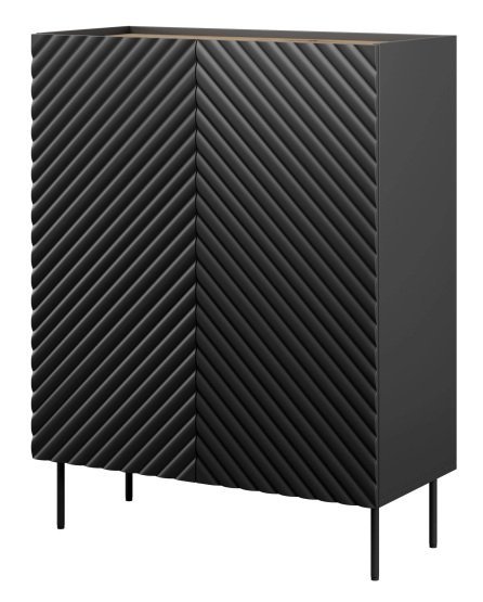 Ohišje komode je izdelano iz laminirane plošče debeline 16 mm, ki zagotavlja trdnost in odpornost proti obrabi. Fronte iz MDF plošče debeline 18 mm so oplemenitene s PVC folijo v črni mat izvedbi, kar ustvarja sodoben videz in olajša vzdrževanje. Zgornja plošča iz laminirane plošče v dekorju artisan debeline 16 mm dopolnjuje celoten dizajn ter omogoča postavitev dodatnih dekorativnih elementov ali osvetlitve.