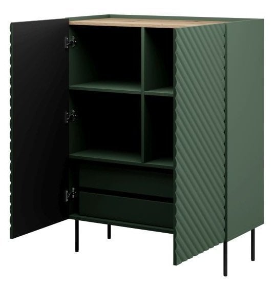 Komoda Onda 2D v temno zeleni barvi predstavlja sodoben kos pohištva, ki združuje estetiko, funkcionalnost in kakovostno izdelavo. Njena robustna konstrukcija iz laminirane plošče debeline 16 mm in MDF front z dodatno PVC folijo zagotavlja dolgo življenjsko dobo ter elegantno površino, ki jo je enostavno čistiti. Komoda s svojo višino 127 cm, širino 98 cm in globino 45 cm ponuja ravno prav prostora za shranjevanje različnih predmetov, hkrati pa se zaradi svojega prefinjenega dizajna lepo zlije z različnimi notranjimi slogi – od modernega do industrijskega.