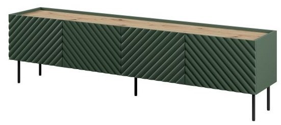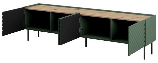 TV komoda Onda 4D v temno zeleni barvi združuje sodoben dizajn, prefinjeno barvno eleganco in funkcionalnost, ki jo pričakujemo od kakovostnega pohištva. Izdelana je v tovarni Halmar na Poljskem ter zasnovana tako, da se prilagodi različnim slogom dnevnih sob – od minimalističnih do klasičnih. Njena oblika z gladkimi frezanimi frontami in kombinacija mat površine z naravno toplino lesa ustvarjata uravnotežen videz, ki prostoru doda značaj in toplino.