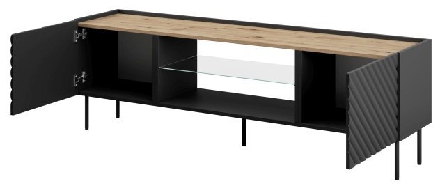 Elegantna kombinacija črne barve in toplega odtenka hrasta artisan daje TV komodi Onda EF izjemno sodoben značaj. Gre za kakovosten kos pohištva, ki s svojo širino 180,5 cm, globino 40 cm in višino 39 cm ponuja dovolj prostora za televizor, avdio opremo in dekorativne dodatke. Komoda je izdelana v tovarni Halmar na Poljskem, kjer se prepletata natančna izdelava in premišljen dizajn. Namenjena je vsem, ki želijo svoj dnevni prostor urediti s pohištvom, ki združuje funkcionalnost, estetiko in trajnost.