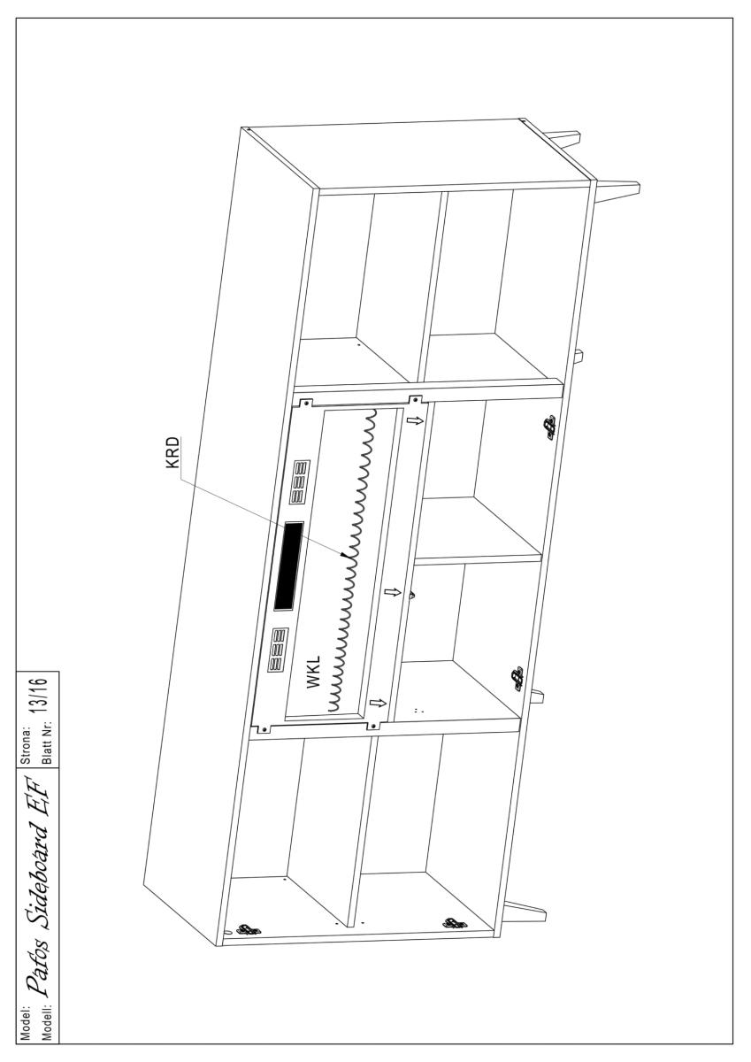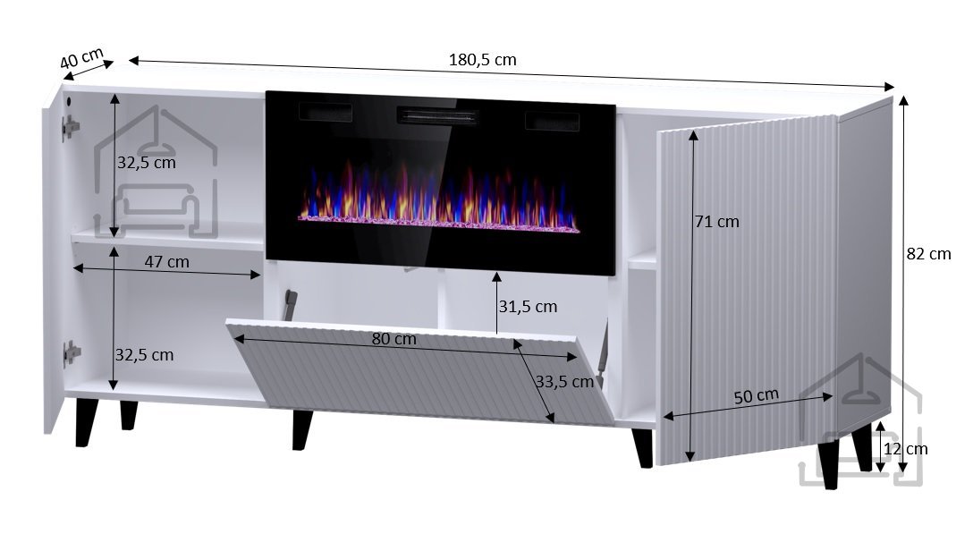 Izdelek ima dimenzije 180,5 × 40 × 82 cm, kar pomeni, da ponuja dovolj prostora za shranjevanje, hkrati pa ohranja uravnotežene proporcije za umestitev v dnevno sobo, jedilnico ali večji hodnik. Zasnova omogoča, da se v srednji del komode vgradi električni kamin, kar ustvarja edinstven vizualni vtis in dodatno funkcionalnost. Kamin se naroča ločeno, kar uporabniku omogoča, da izbere model, ki najbolj ustreza njegovim željam in tehničnim zahtevam.