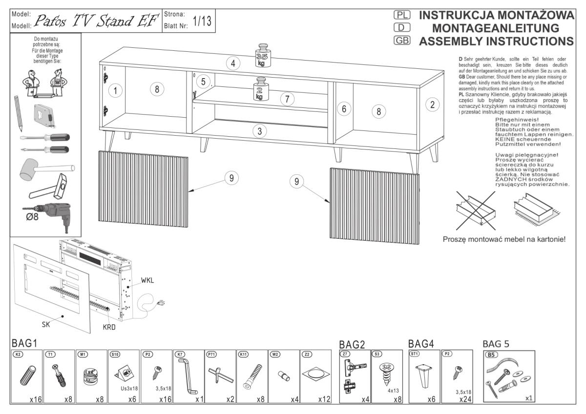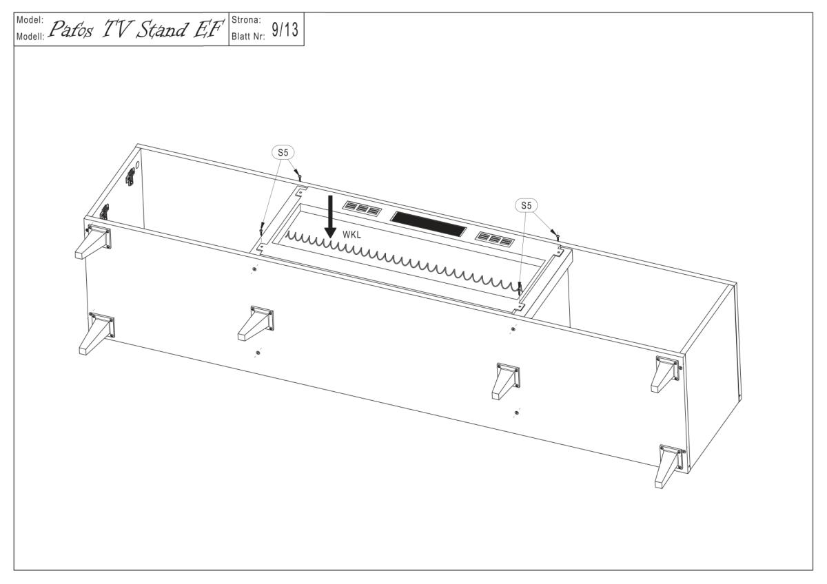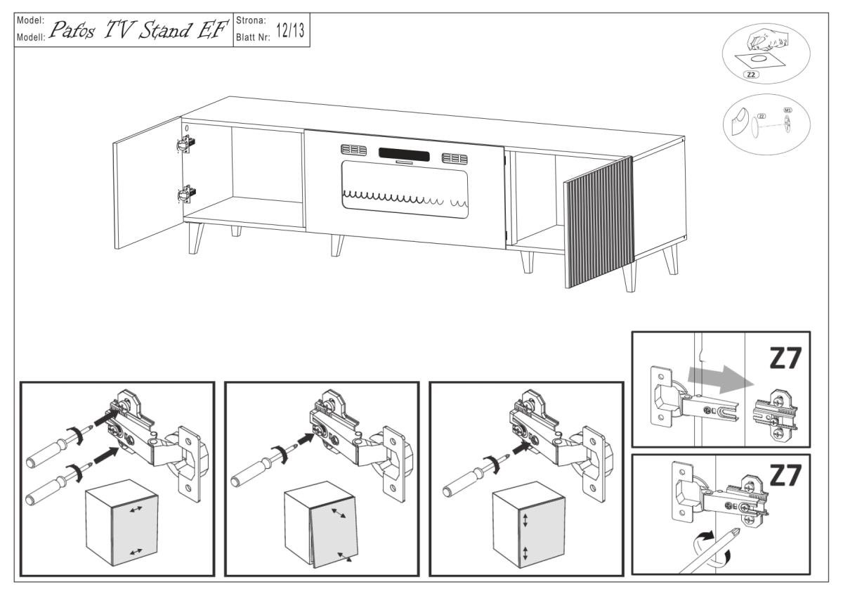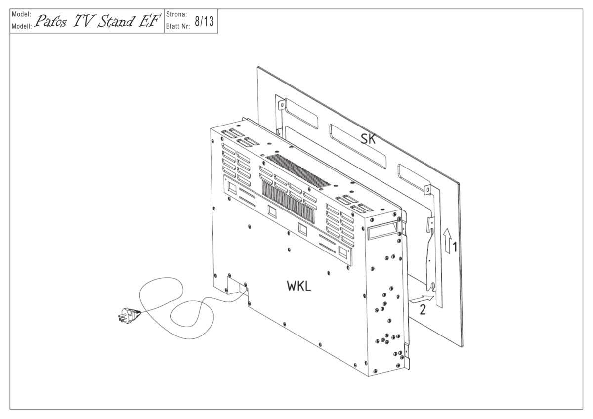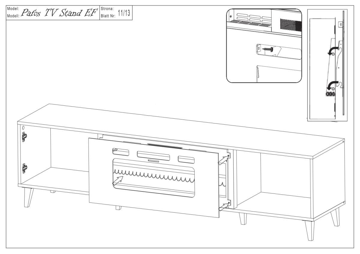 Ena izmed največjih prednosti komode Pafos EF je možnost integracije električnega kamina. V središčnem delu konstrukcije je predviden prostor, v katerega se lahko vgradi ustrezen model kamina (ni priložen). Takšna rešitev omogoča prijetno atmosfero v prostoru in vizualno toplino brez dimnih izpustov. Kombinacija mat črne površine in svetlobnih učinkov kamina ustvarja izrazit kontrast, ki se odlično ujema z modernimi, industrijskimi ali minimalističnimi interierji.