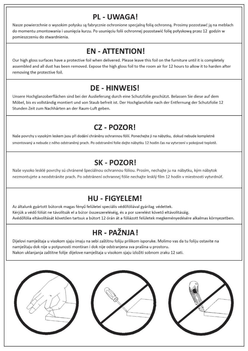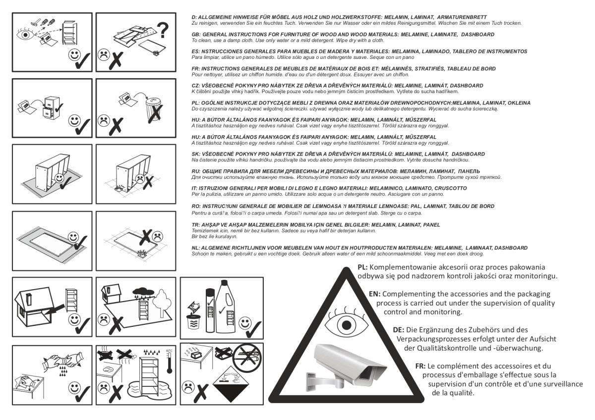 Plastične noge komode poskrbijo za stabilno postavitev tudi na neenakomernih tleh, hkrati pa ščitijo tla pred praskami. Zahvaljujoč enostavni konstrukciji je montaža preprosta in omogoča hitro sestavo tudi brez strokovne pomoči. Laminirane površine je mogoče čistiti z mehko, rahlo vlažno krpo brez agresivnih čistil, kar poenostavi vzdrževanje in podaljšuje življenjsko dobo izdelka.