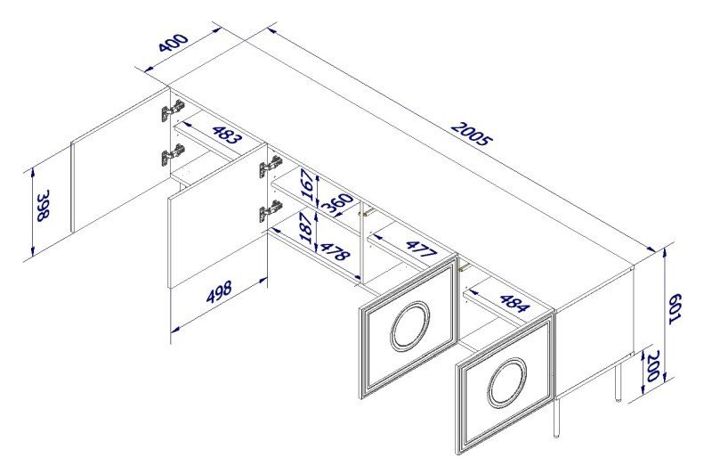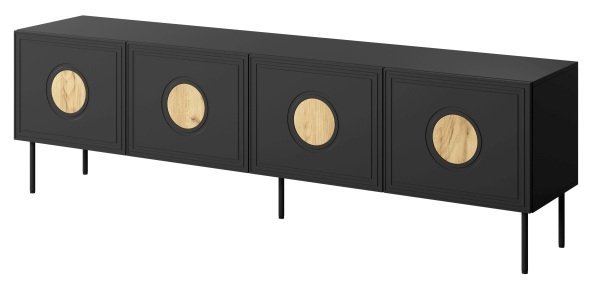 Zaradi svoje dolžine 200 cm komoda ponuja dovolj prostora za televizorje večjih diagonal, hkrati pa spodaj ostaja prostor za dodatno opremo ali dekorativne elemente. Globina 42 cm omogoča optimalno stabilnost in uravnoteženo razmerje med prostornostjo in kompaktnostjo, kar je še posebej pomembno v manjših dnevnih prostorih. Višina 60 cm zagotavlja udoben pogled na zaslon iz sedeže višine standardnega kavča.