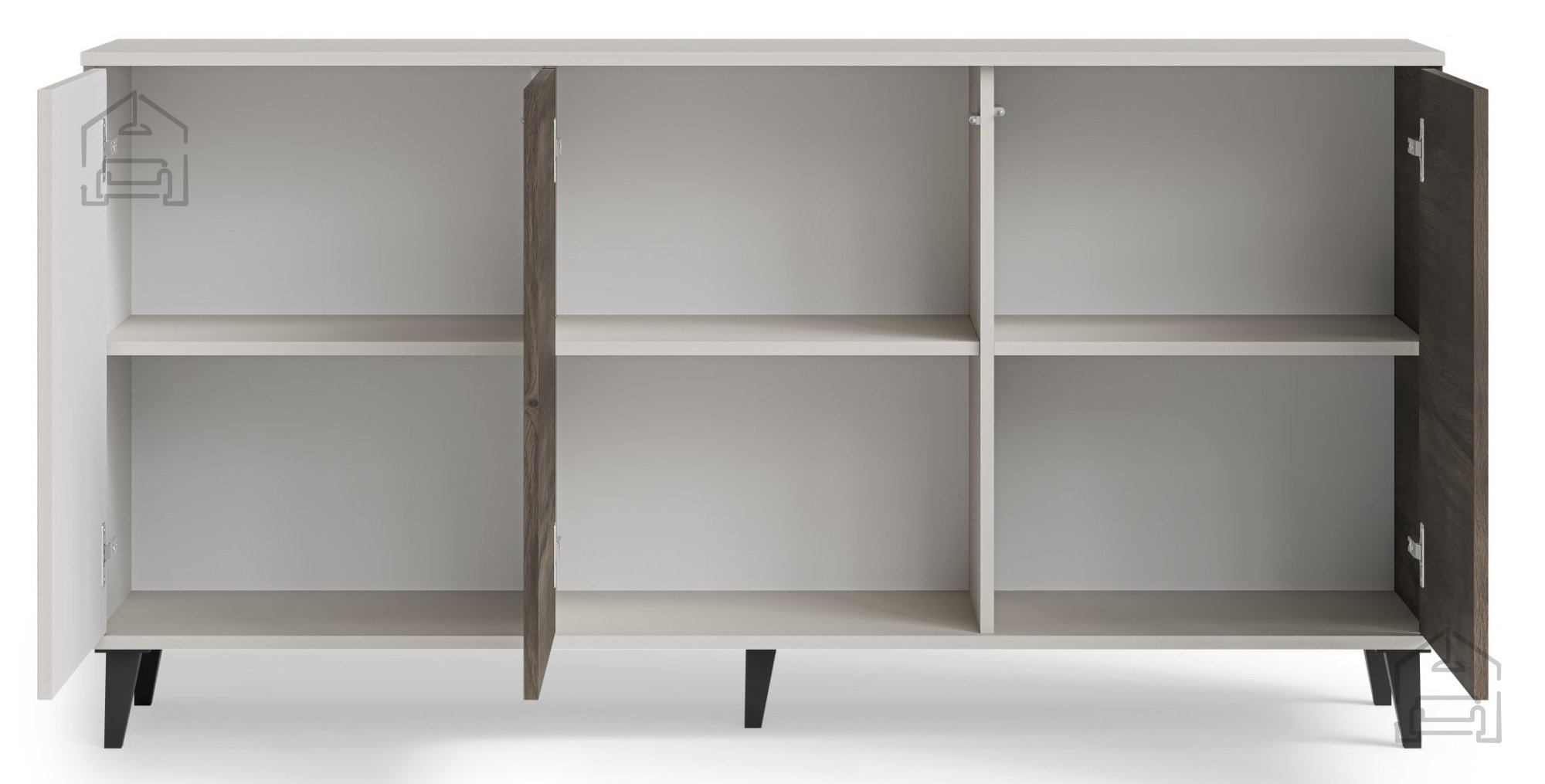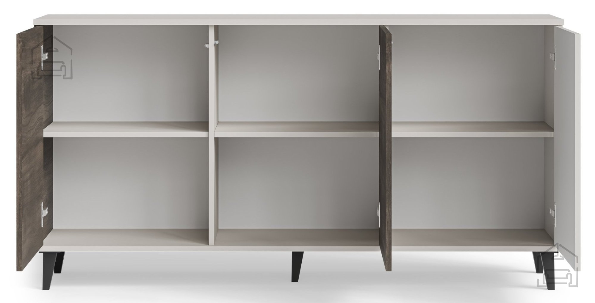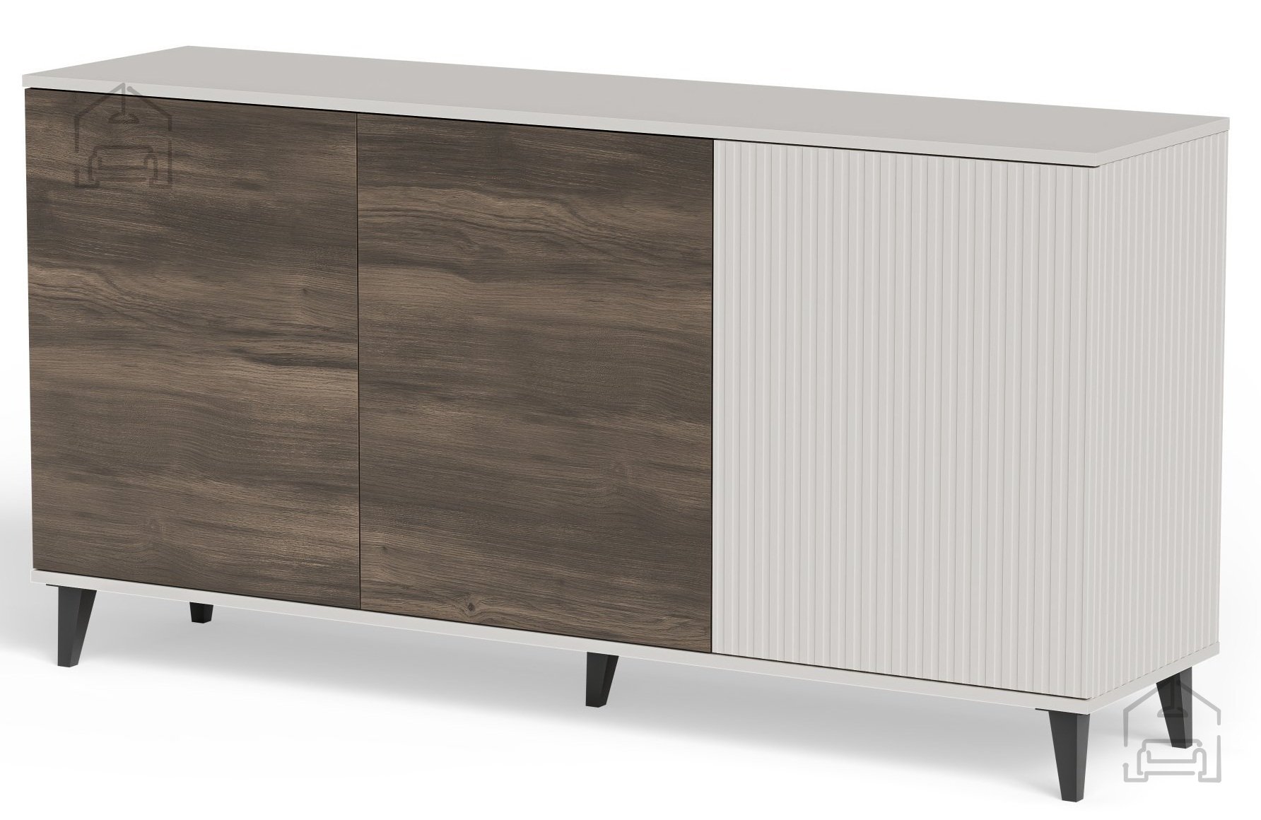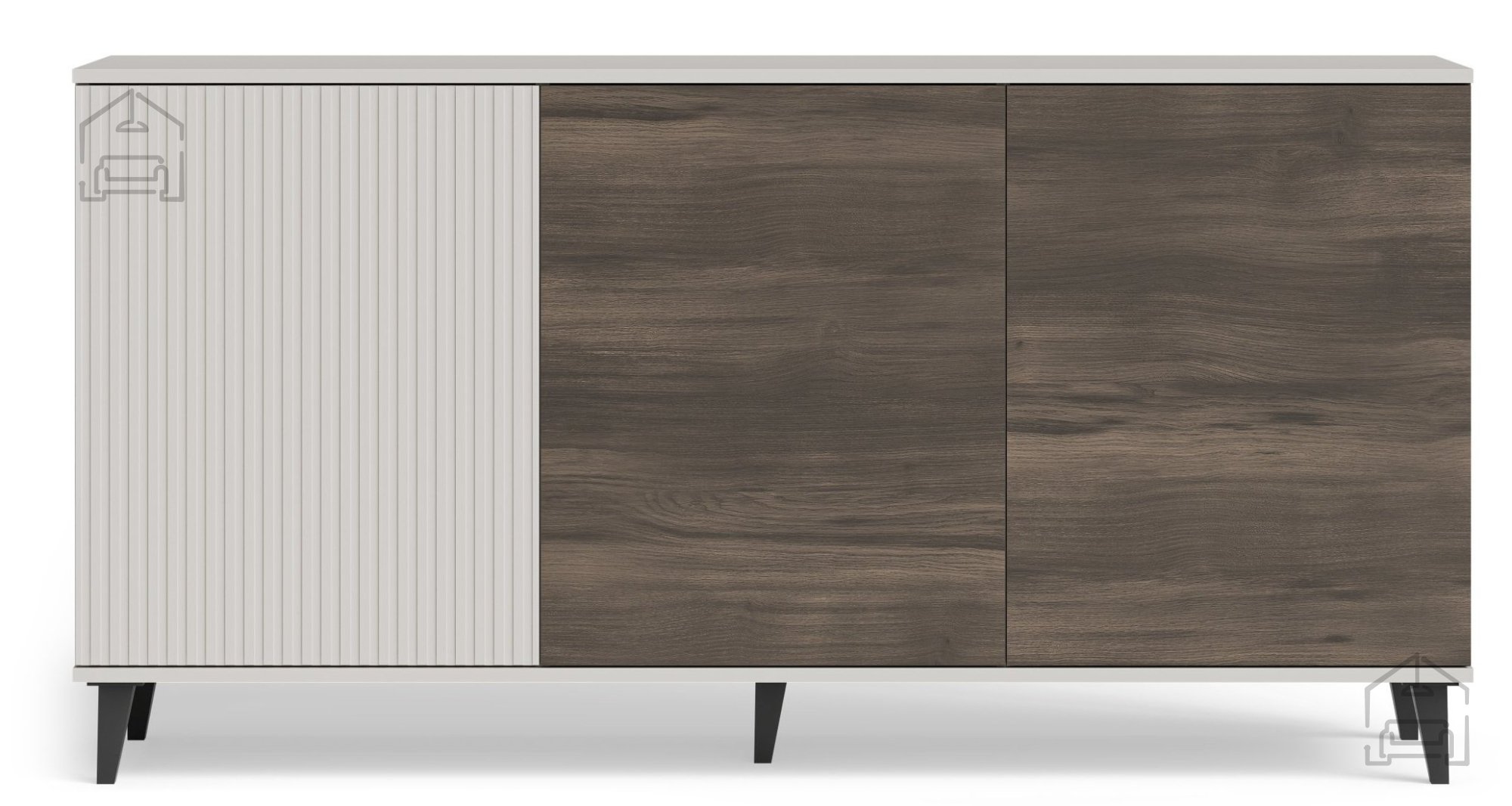 Komoda Random 2 KM-1 znamke Halmar združuje sodoben videz z uravnoteženo kombinacijo toplih in nevtralnih tonov. Površina v odtenku kašmirja, poudarki v barvi oreha ter kontrastni črni elementi ustvarjajo eleganten, a hkrati domač vtis. S svojimi merami 160x40x82 cm se komoda popolnoma prilega dnevnim sobam, jedilnicam ali hodnikom, kjer je pomembna tako funkcionalnost kot estetski vtis.