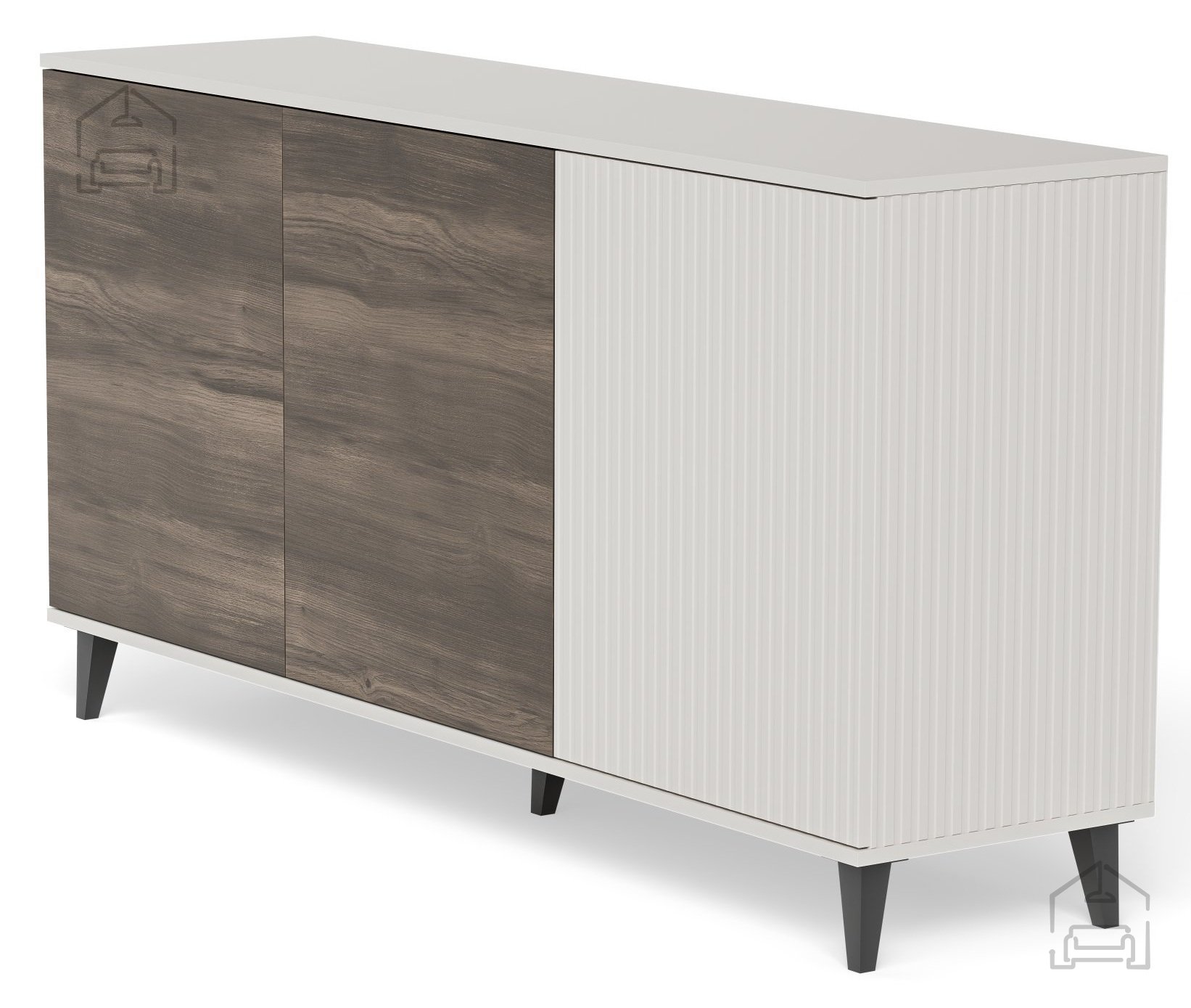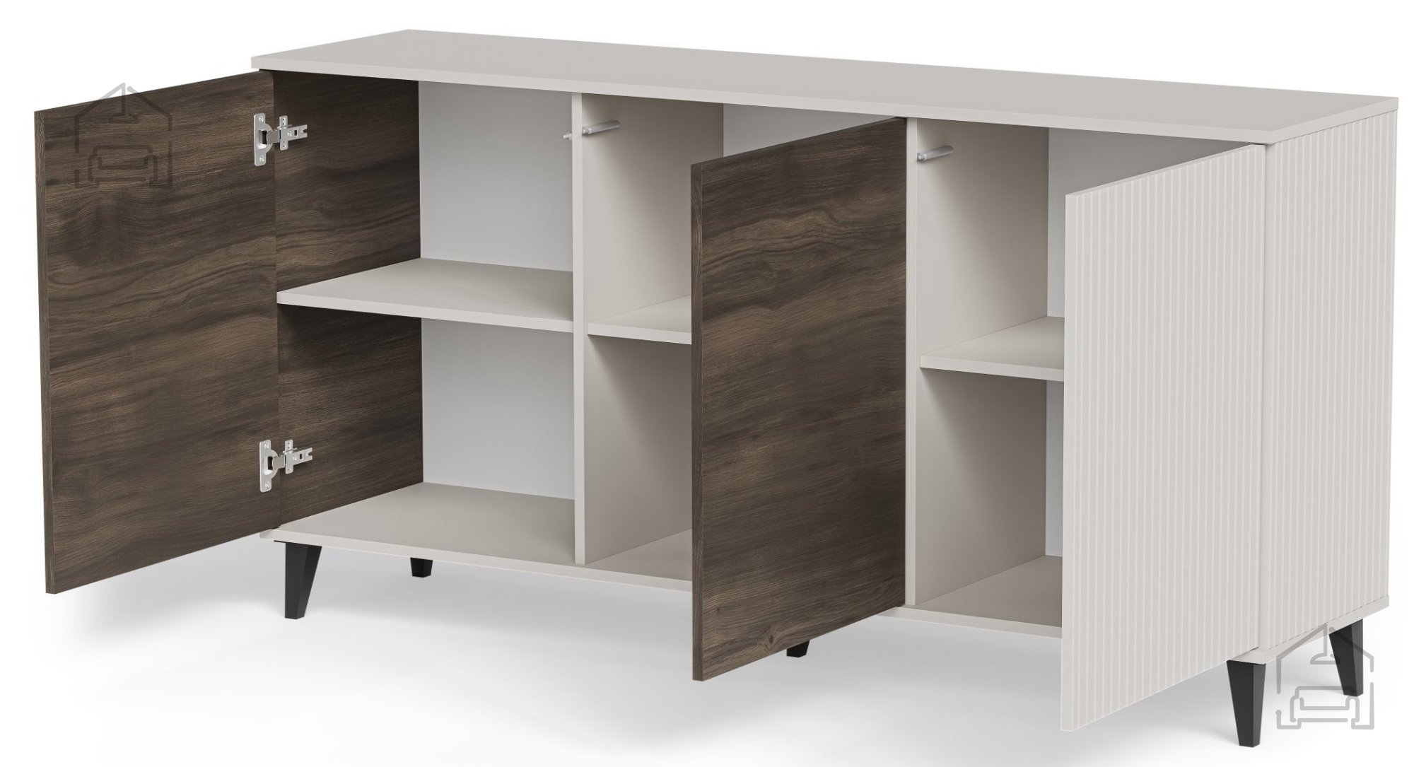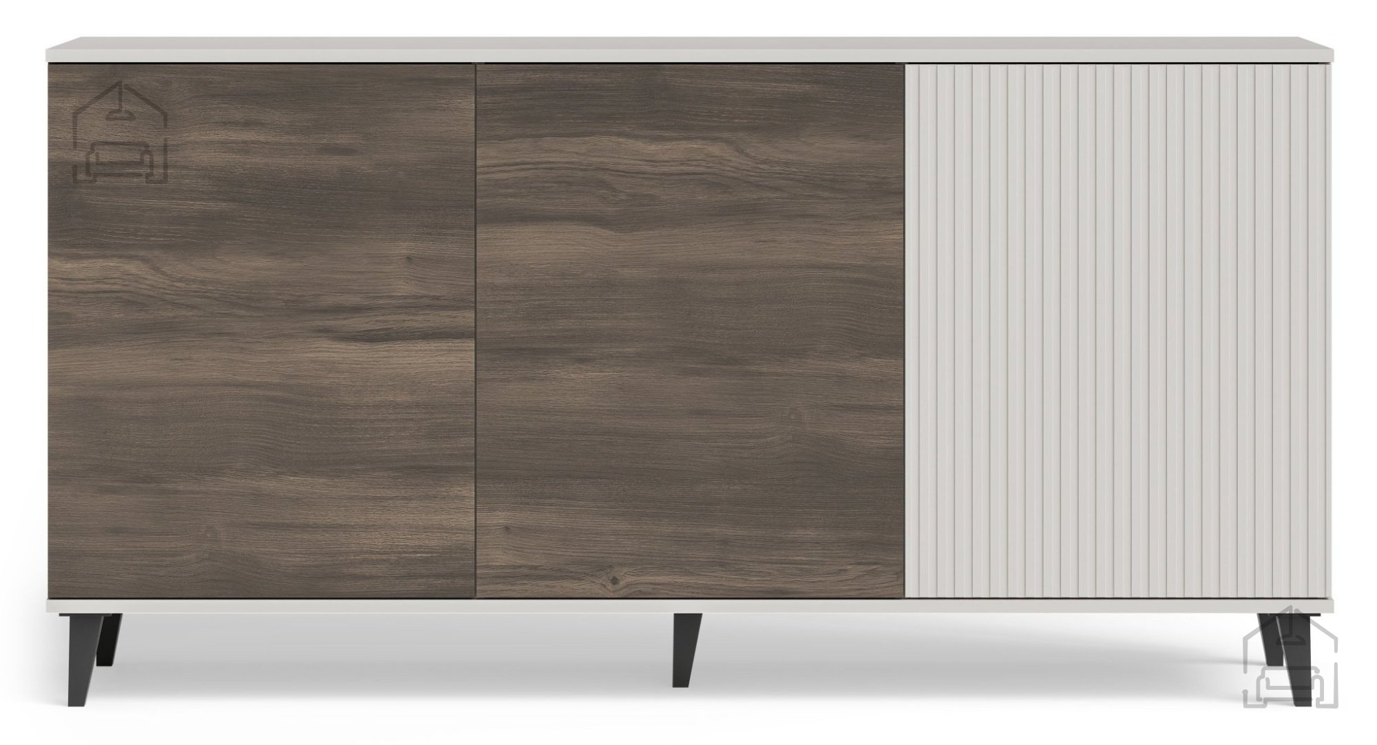Komoda Random 2 KM-1 znamke Halmar združuje sodoben videz z uravnoteženo kombinacijo toplih in nevtralnih tonov. Površina v odtenku kašmirja, poudarki v barvi oreha ter kontrastni črni elementi ustvarjajo eleganten, a hkrati domač vtis. S svojimi merami 160x40x82 cm se komoda popolnoma prilega dnevnim sobam, jedilnicam ali hodnikom, kjer je pomembna tako funkcionalnost kot estetski vtis.