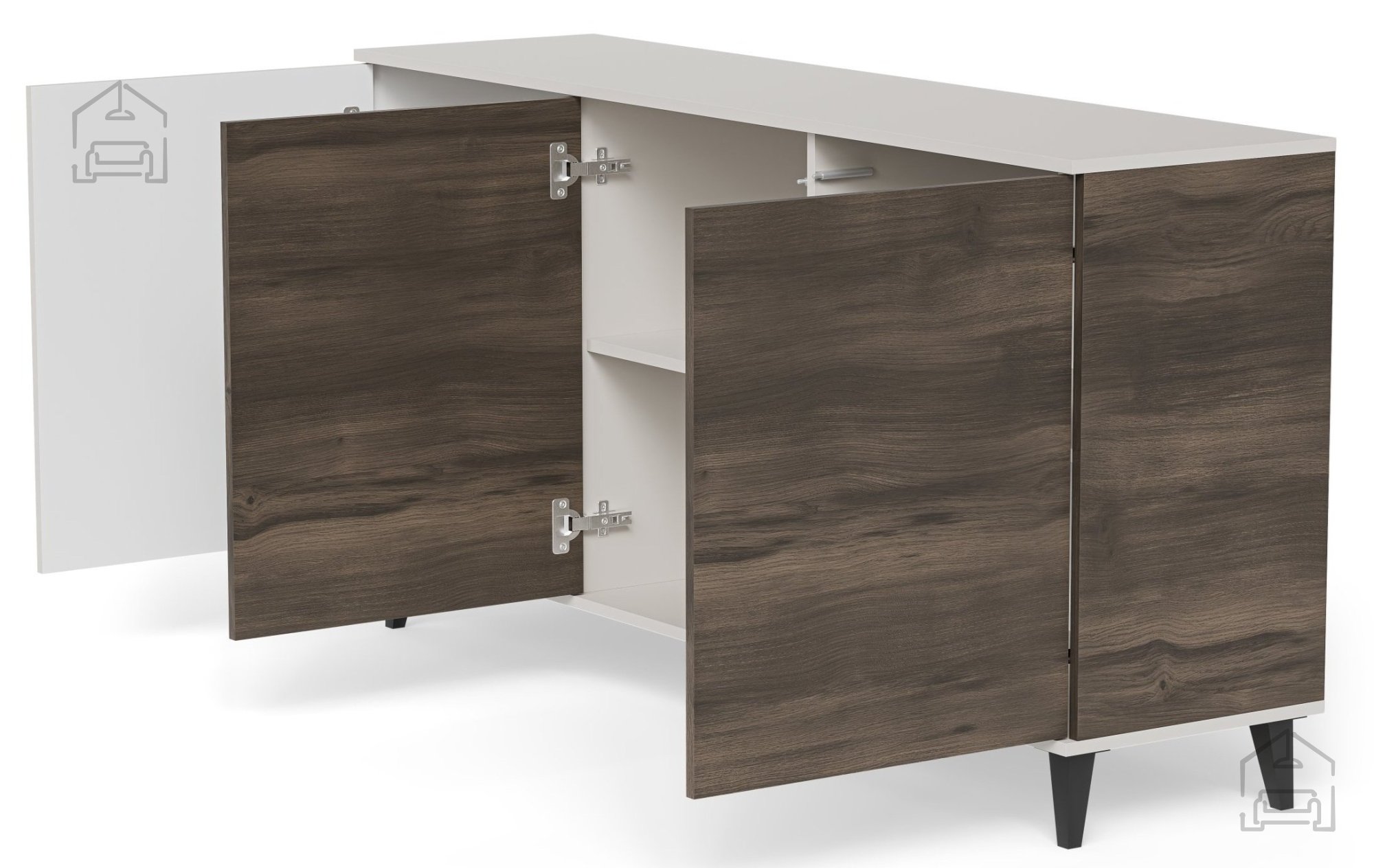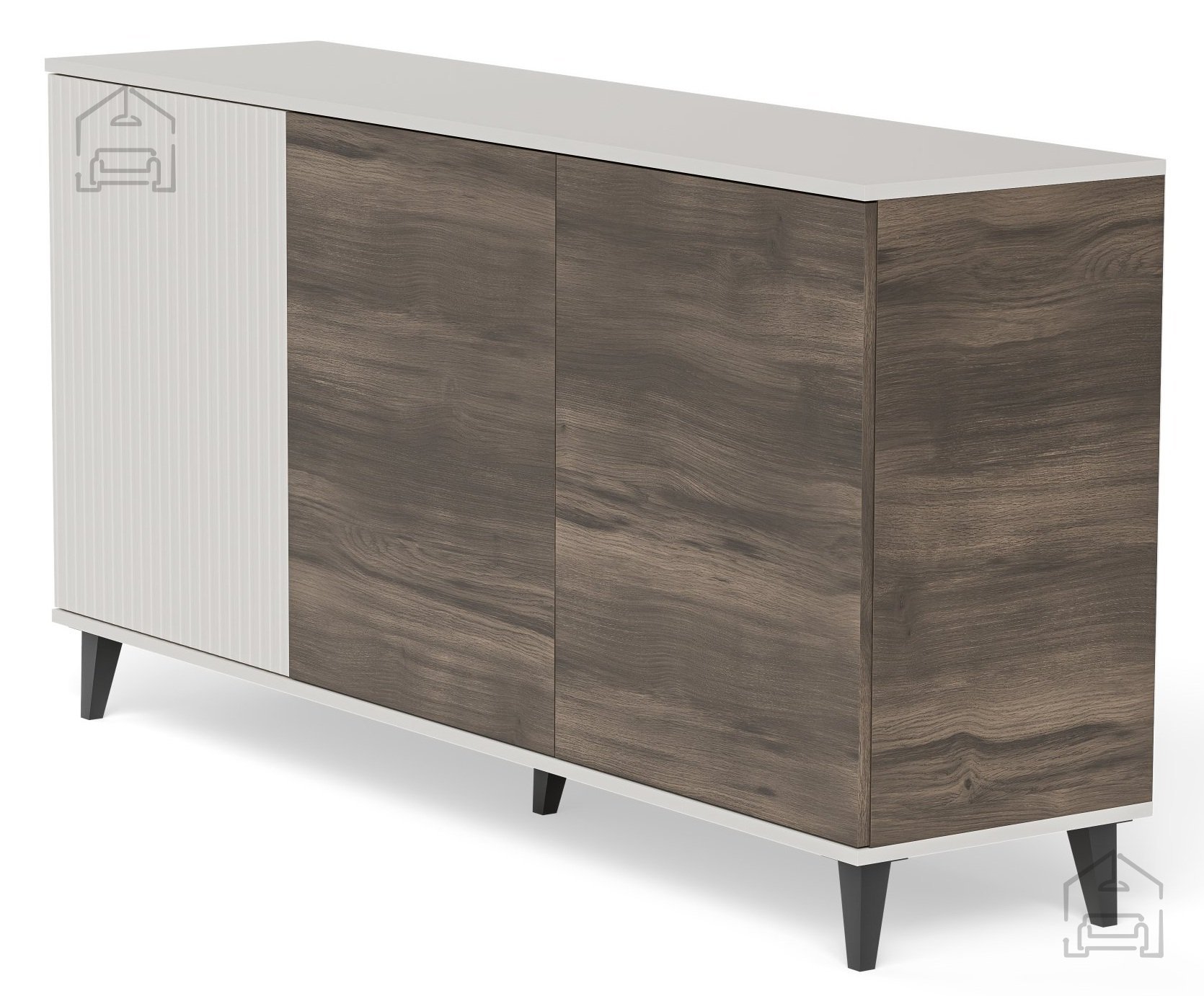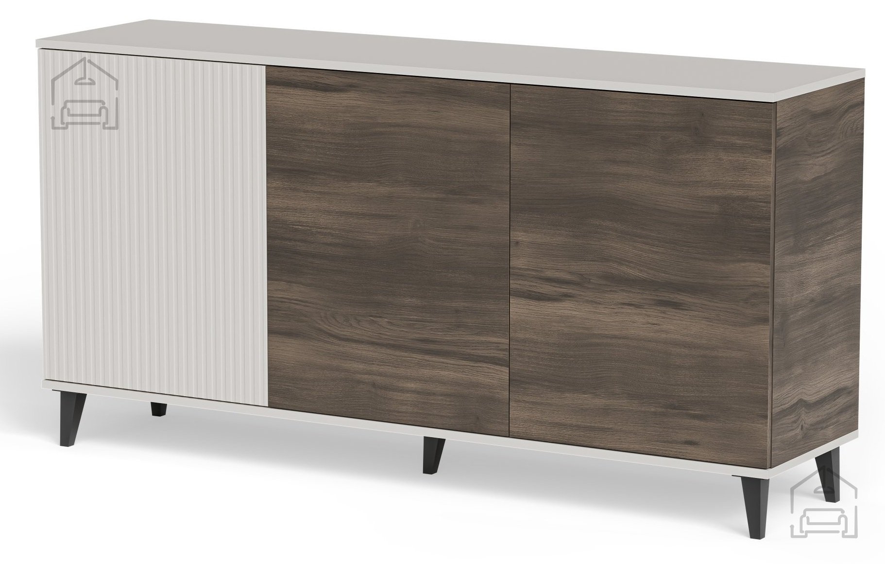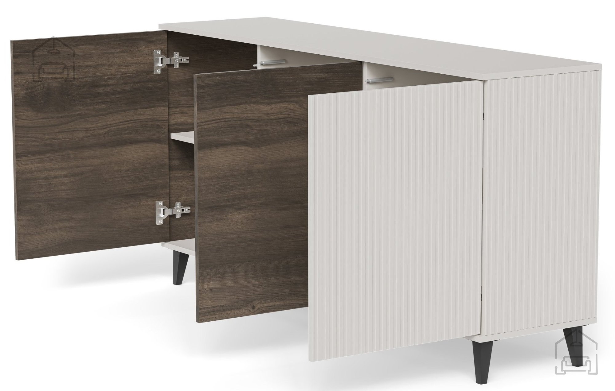 Komoda Random 2 KM-1 znamke Halmar združuje sodoben videz z uravnoteženo kombinacijo toplih in nevtralnih tonov. Površina v odtenku kašmirja, poudarki v barvi oreha ter kontrastni črni elementi ustvarjajo eleganten, a hkrati domač vtis. S svojimi merami 160x40x82 cm se komoda popolnoma prilega dnevnim sobam, jedilnicam ali hodnikom, kjer je pomembna tako funkcionalnost kot estetski vtis.