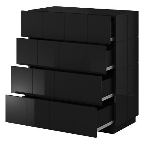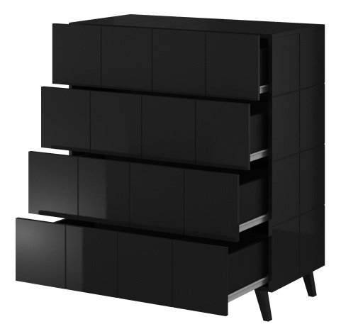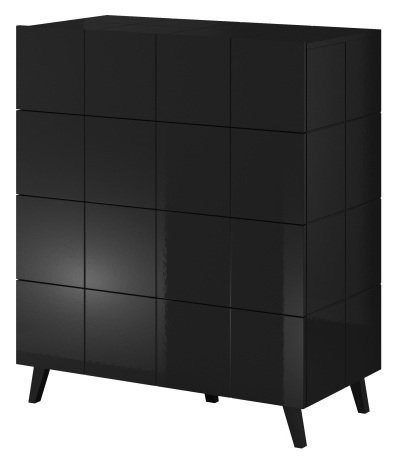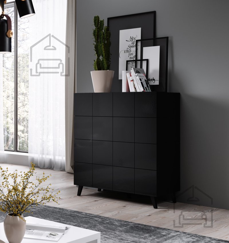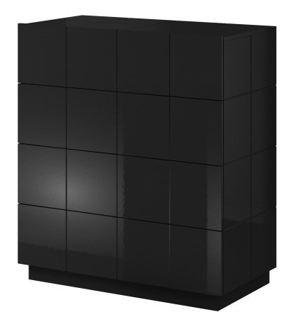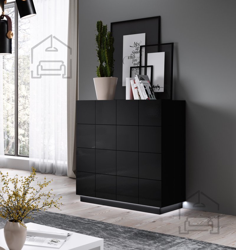 Fronte in zgornja plošča komode so izdelane iz MDF plošče, frezane in lakirane v visokem sijaju. Črna barva v sijajnem finišu daje površini globino in odsev, ki prostor optično poveča in mu doda pridih razkošja. Bočne stranice so prav tako iz MDF plošče, enako obdelane, kar zagotavlja enoten videz iz vseh zornih kotov. Ostali deli konstrukcije so iz laminirane iverne plošče, ki skrbi za stabilnost in trajnost komode.