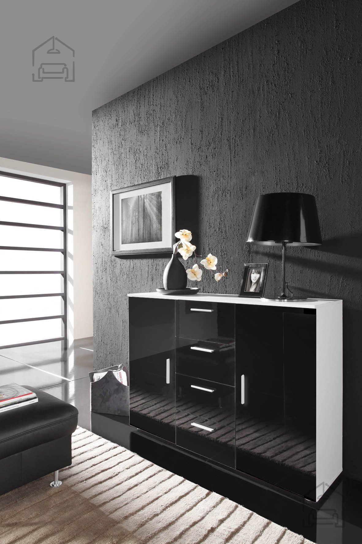 Komoda Uni je sodoben kos pohištva, ki s svojo izrazito barvno kombinacijo in sijajnimi površinami pritegne pozornost ter prostoru doda pridih prefinjenosti. Zunanja podoba komode združuje kontrast med belo in črno barvo v sijaj izvedbi, kar ustvarja vizualno harmonijo in sodoben značaj. Njena univerzalna oblika omogoča umestitev v različne prostore – dnevno sobo, predsobo ali spalnico – kjer želi uporabnik dodati funkcionalen, a hkrati estetsko dovršen element.