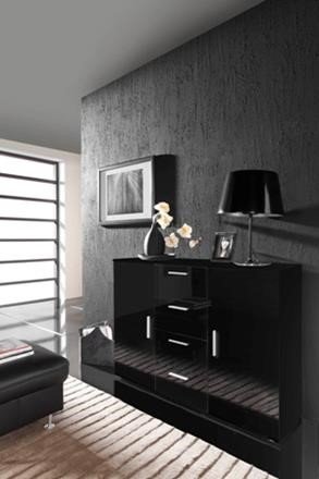 Črna sijajna barva komode Uni ustvarja občutek prestiža in sodobnosti. Površina z visokim sijajem odseva svetlobo in naredi prostor vizualno večji, medtem ko mat stranice poskrbijo za uravnotežen, miren vtis. Plastični ročaji so diskretno oblikovani, da se zlijejo z minimalistično zasnovo, hkrati pa omogočajo udobno odpiranje vrat ali predalov. Tak dizajn se lepo ujema tako z modernimi kot tudi z bolj klasičnimi interierji.