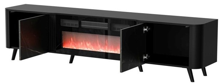 TV komoda Volare 200 EF blagovne znamke Halmar združuje sodoben dizajn, funkcionalnost in estetsko dovršenost. Njena črna mat barva v kombinaciji z dekorjem črne san sebastian ustvarja eleganten kontrast, ki se popolno ujema z različnimi stili notranje opreme – od minimalističnega do industrijskega. Izdelek prinaša tudi posebno prednost: možnost vgradnje električnega kamina (naroči se posebej), kar prostoru doda toplino in edinstven vizualni učinek.