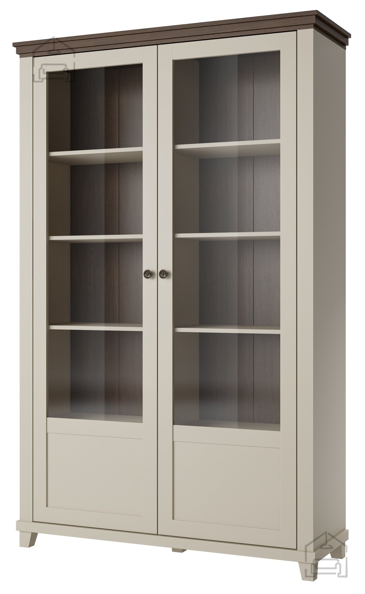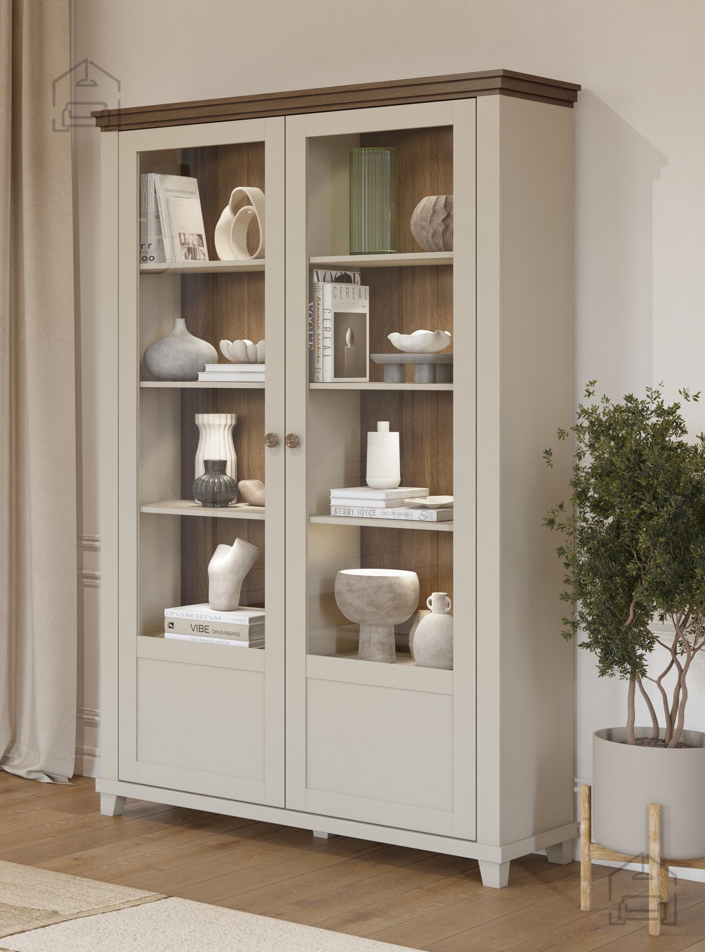 Elegantna kombinacija svetlo bež odtenkov in naravnega videza lesa: Široka vitrina Evora – Helvetia Meble.