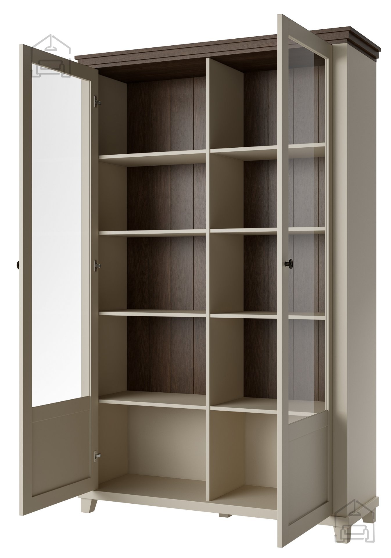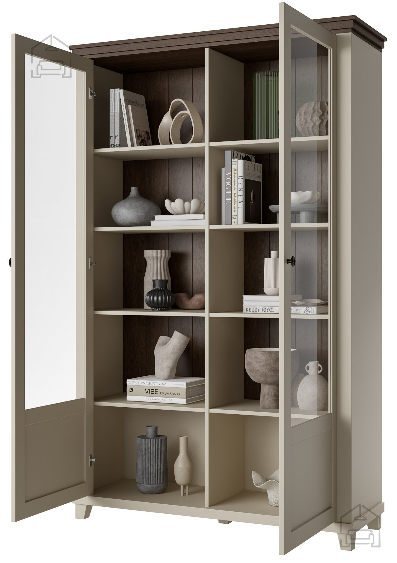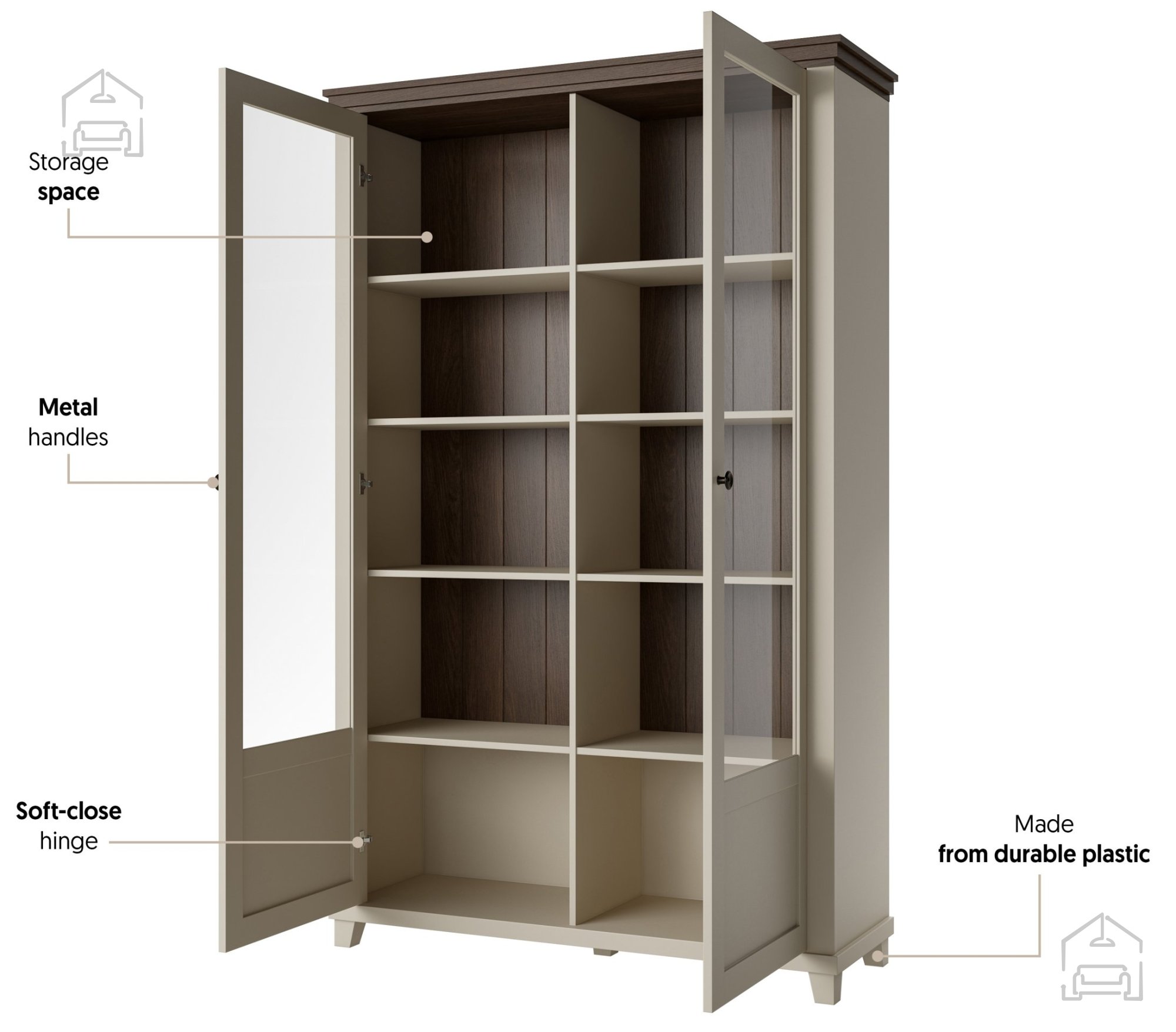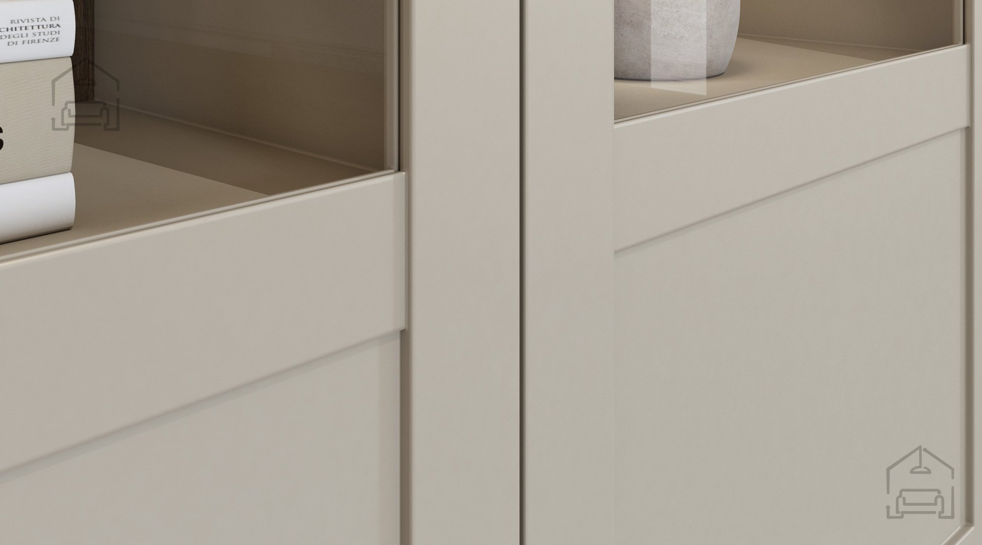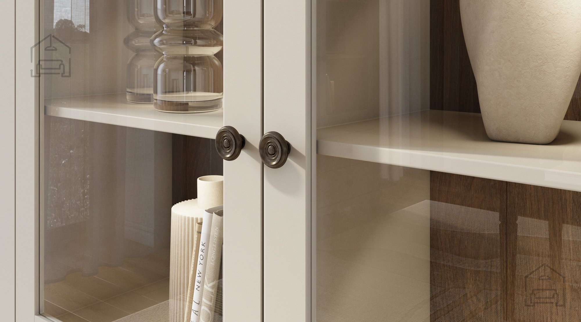 Vitrina Evora se enako dobro obnese v različnih prostorih. V dnevni sobi lahko služi kot razstavna enota za dekorativne predmete, v jedilnici pa kot prostor za shranjevanje posode in kozarcev. V predsobi jo lahko uporabite za urejanje dokumentov ali odlaganje dodatkov. Zaradi nevtralne barvne sheme in elegantnih linij se zlahka uskladi z drugimi barvami in teksturami v prostoru.