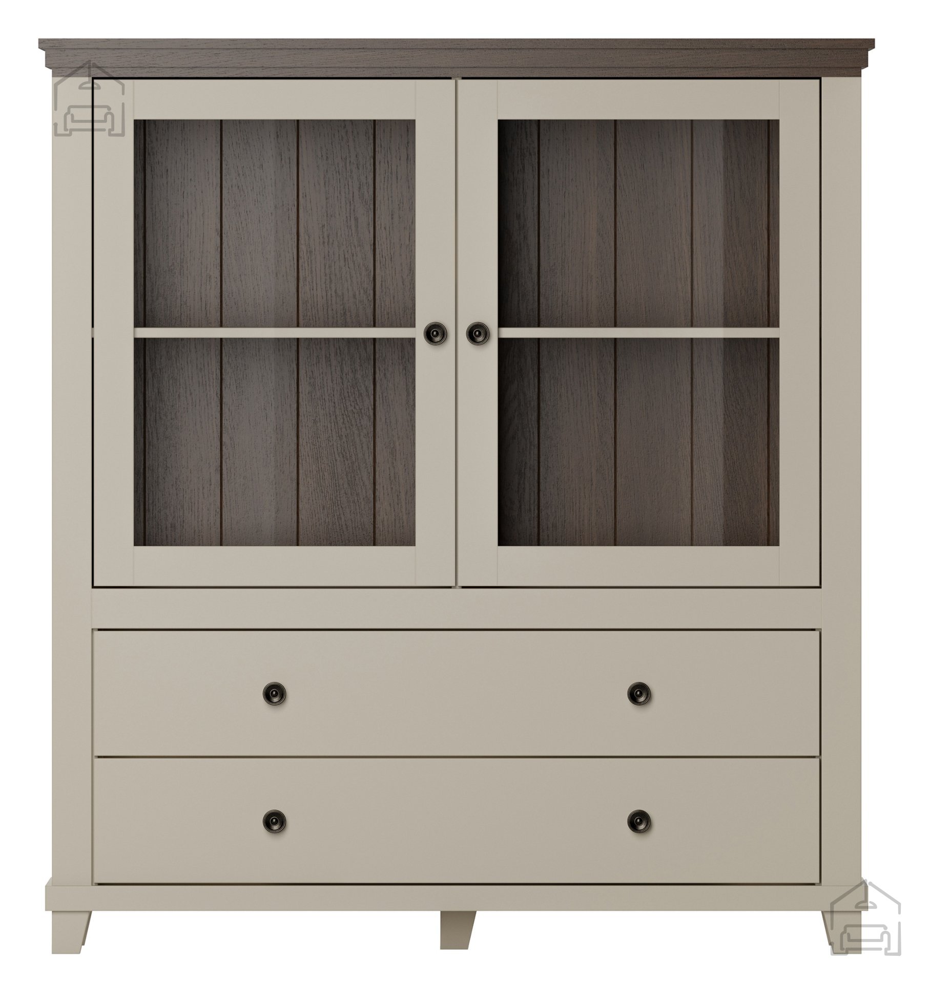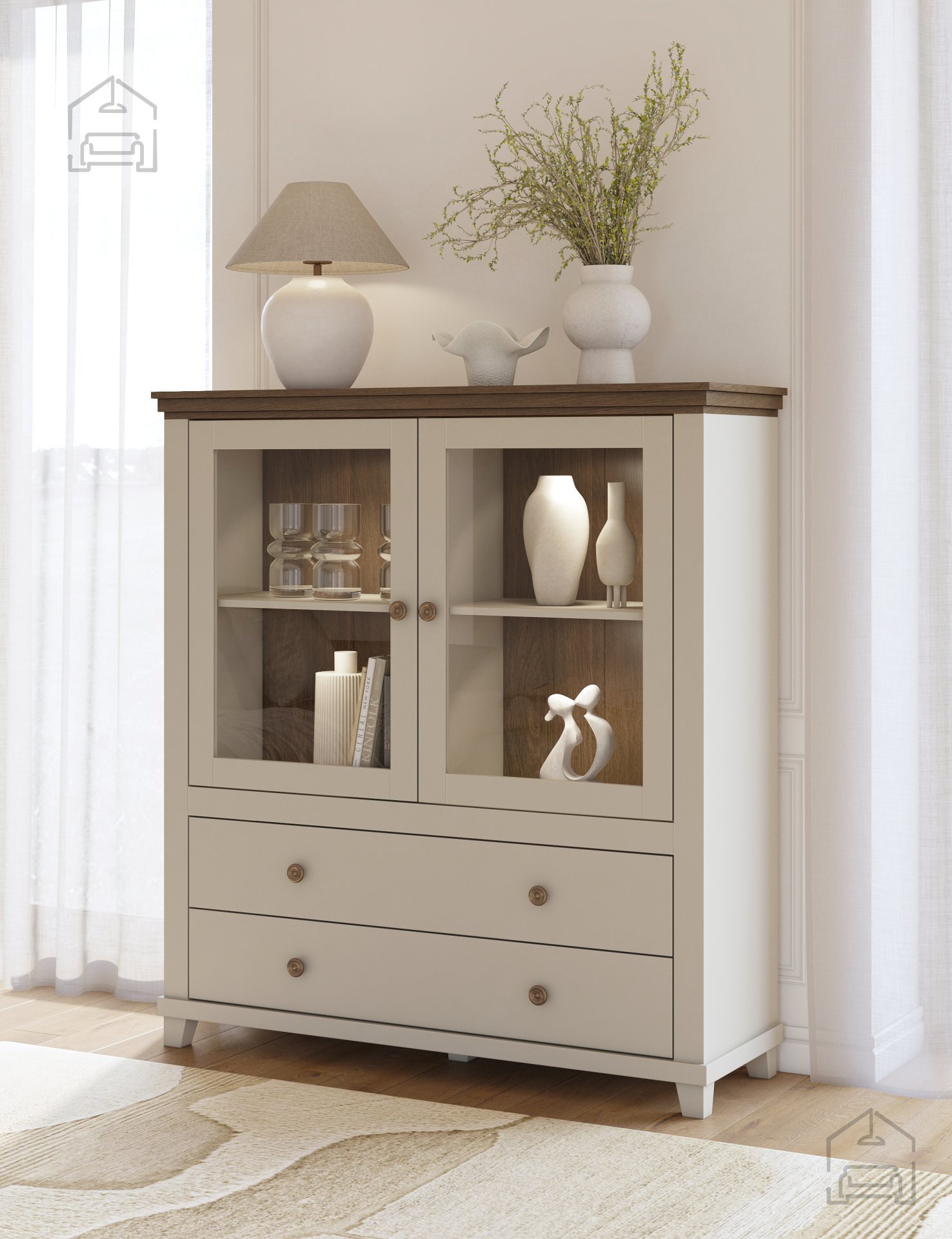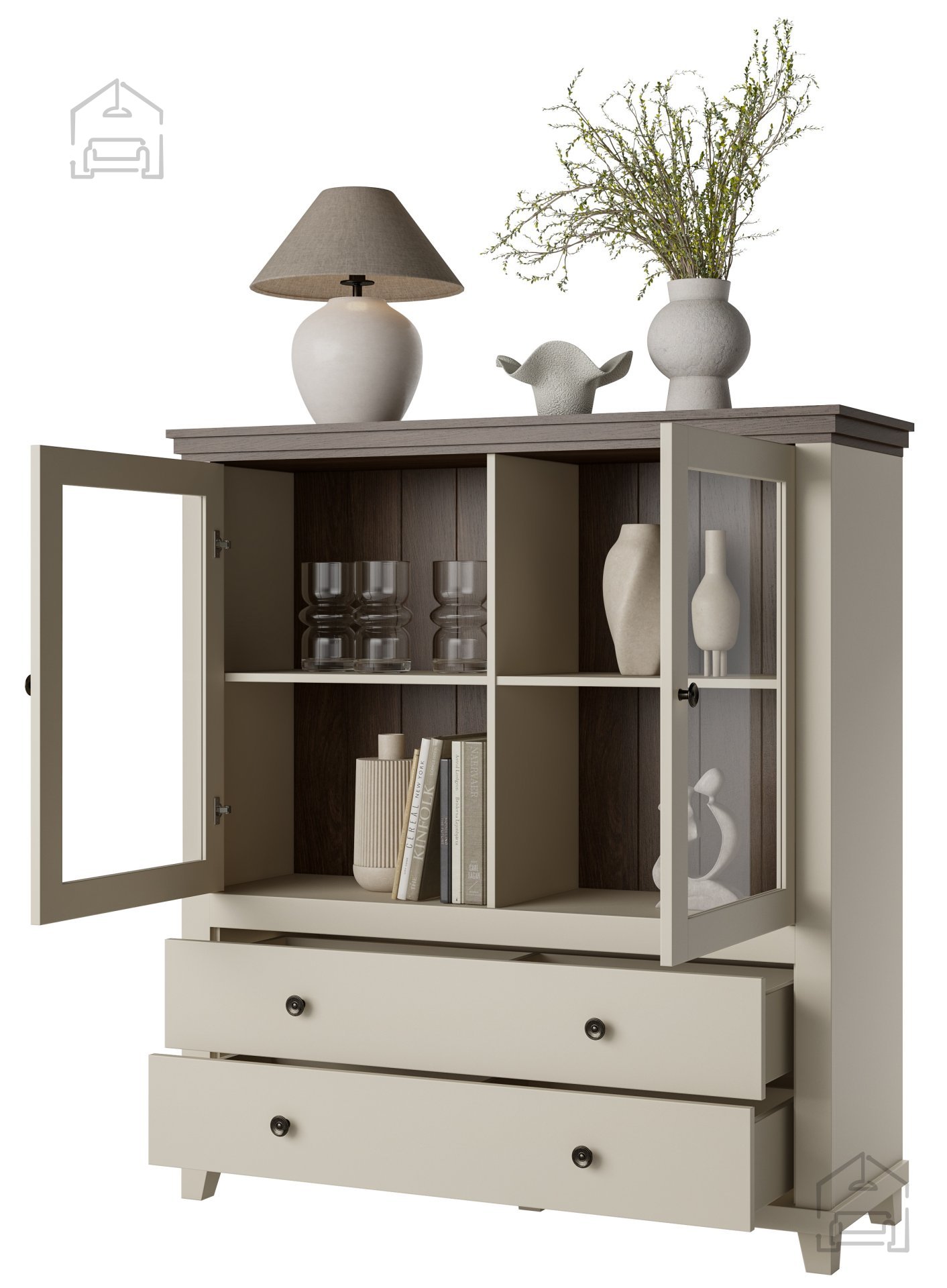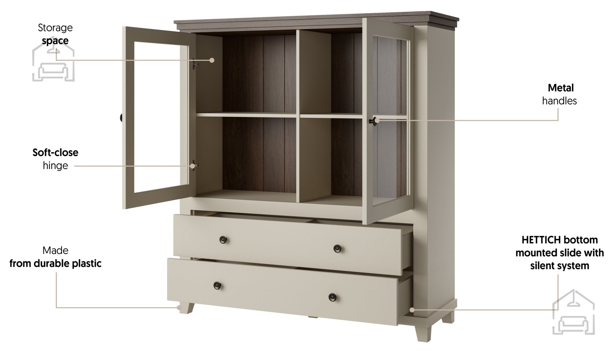 Model Evora 24D1JU46 vključuje dve vratni krili in dva predala, kar omogoča raznovrstno shranjevanje. Zgornji del je primeren za razstavo dekorativnih predmetov, porcelana ali stekla, spodnji predali pa nudijo prostor za dokumente, tekstil ali druge manj vidne predmete. Takšna razporeditev omogoča, da je prostor vedno urejen, pri tem pa ostaja vizualno privlačen.