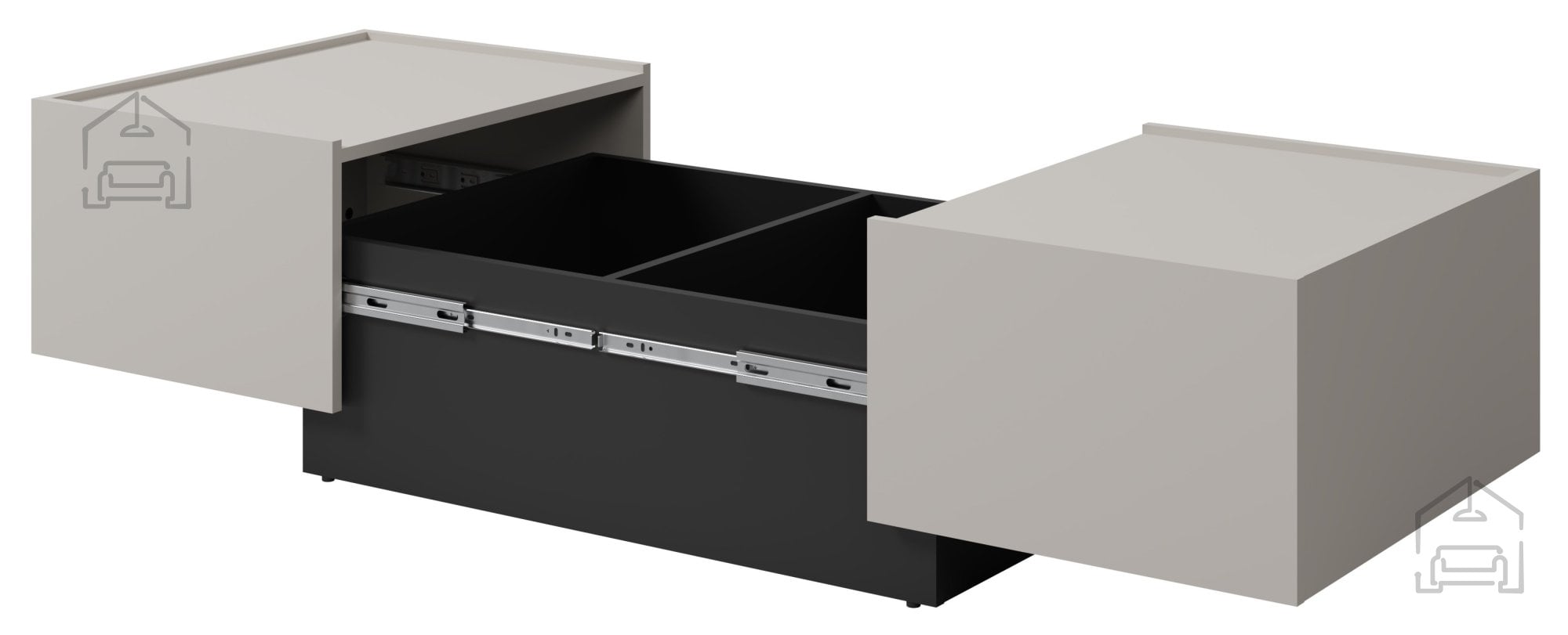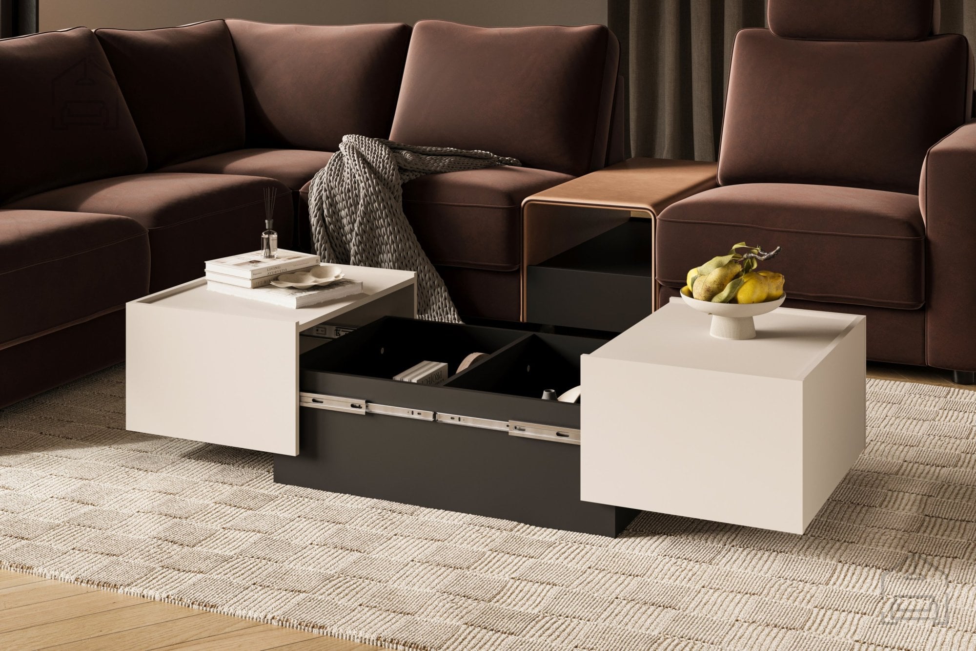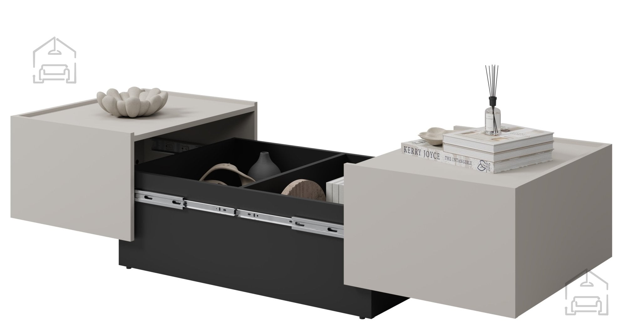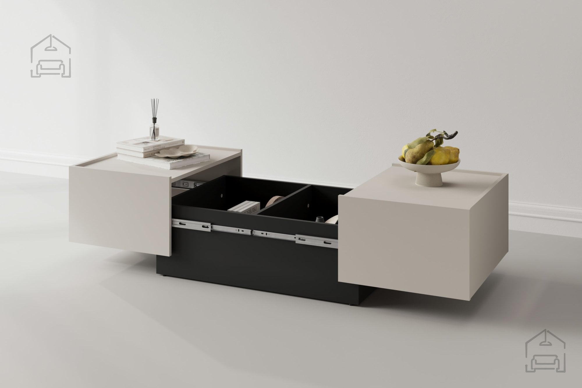 Eden izmed ključnih adutov modela Eko – kašmir/črna je njegova izvlečna funkcija. Z enostavnim gibom se površina razširi, kar zagotavlja dodaten prostor za delo, igranje družabnih iger ali postrežbo gostov. Ko funkcije ne potrebujete, se mizica preprosto vrne v svoj osnovni, kompaktni položaj. Pod zgornjo ploščo se skriva priročen predal za shranjevanje, ki omogoča urejen videz dnevnega prostora – idealen za shranjevanje daljincev, revij, polnilcev ali drugih drobnarij, ki bi sicer zavzele površino mize.