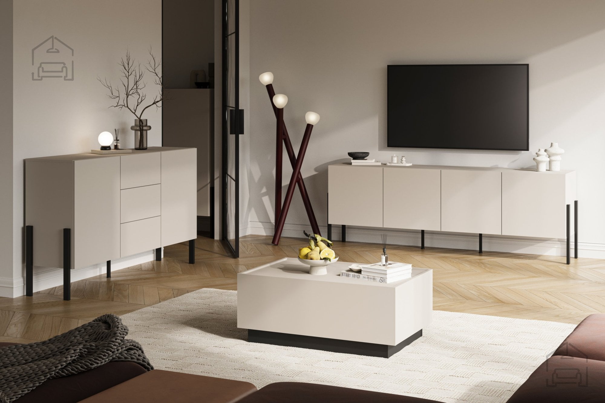 Mizica Eko izstopa s kombinacijo fronte v barvi kašmir in ohišja v črnem oniksu, kar ustvarja prefinjen kontrast. Ta barvna kombinacija je značilna za sodoben minimalizem, ki se odlično ujema z različnimi notranjimi slogi – od skandinavske preprostosti do industrijskega pridiha. Površina v toplih tonih kašmirja doda prostoru občutek mehkobe, temen okvir pa prinaša stabilnost in vizualno globino.