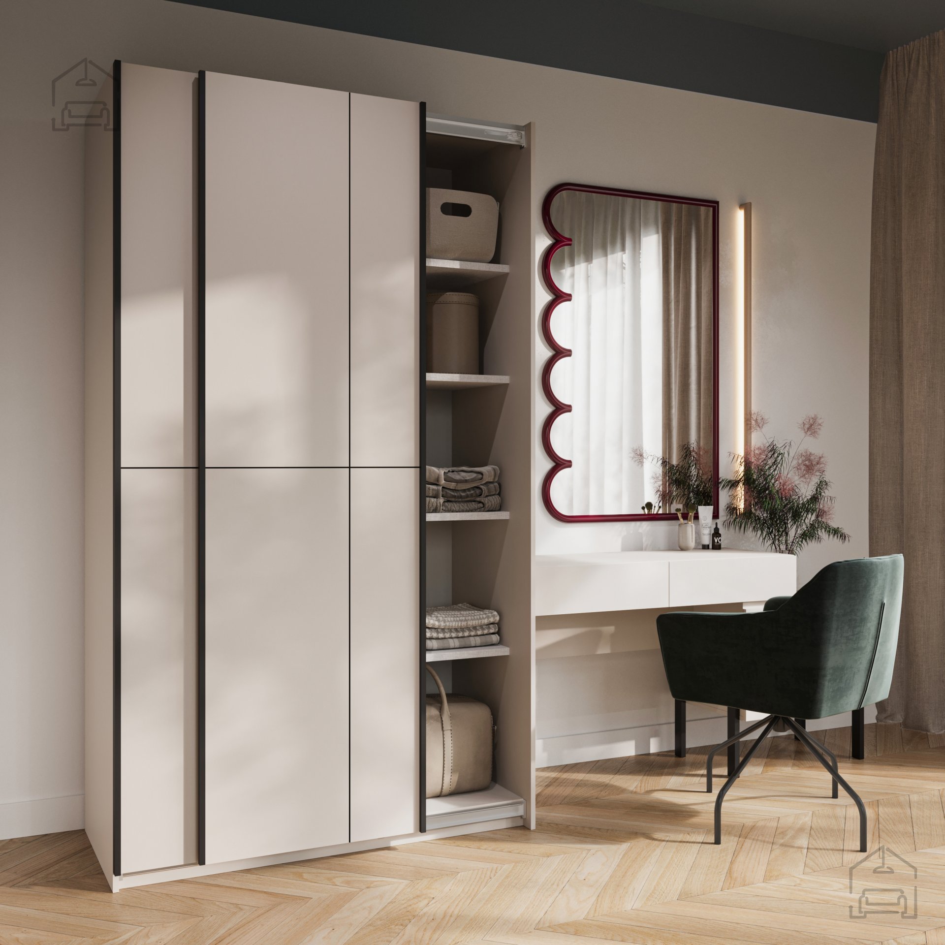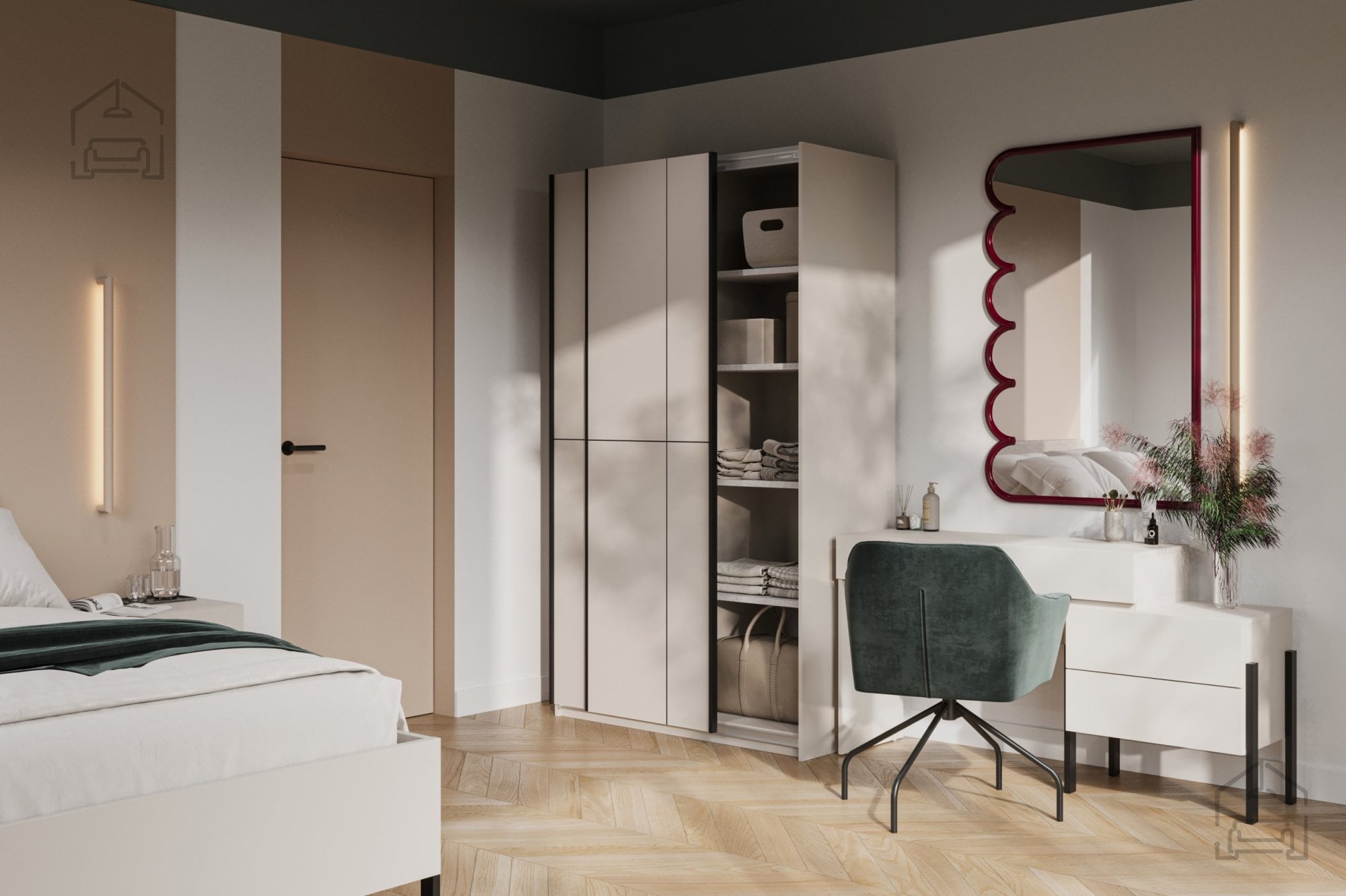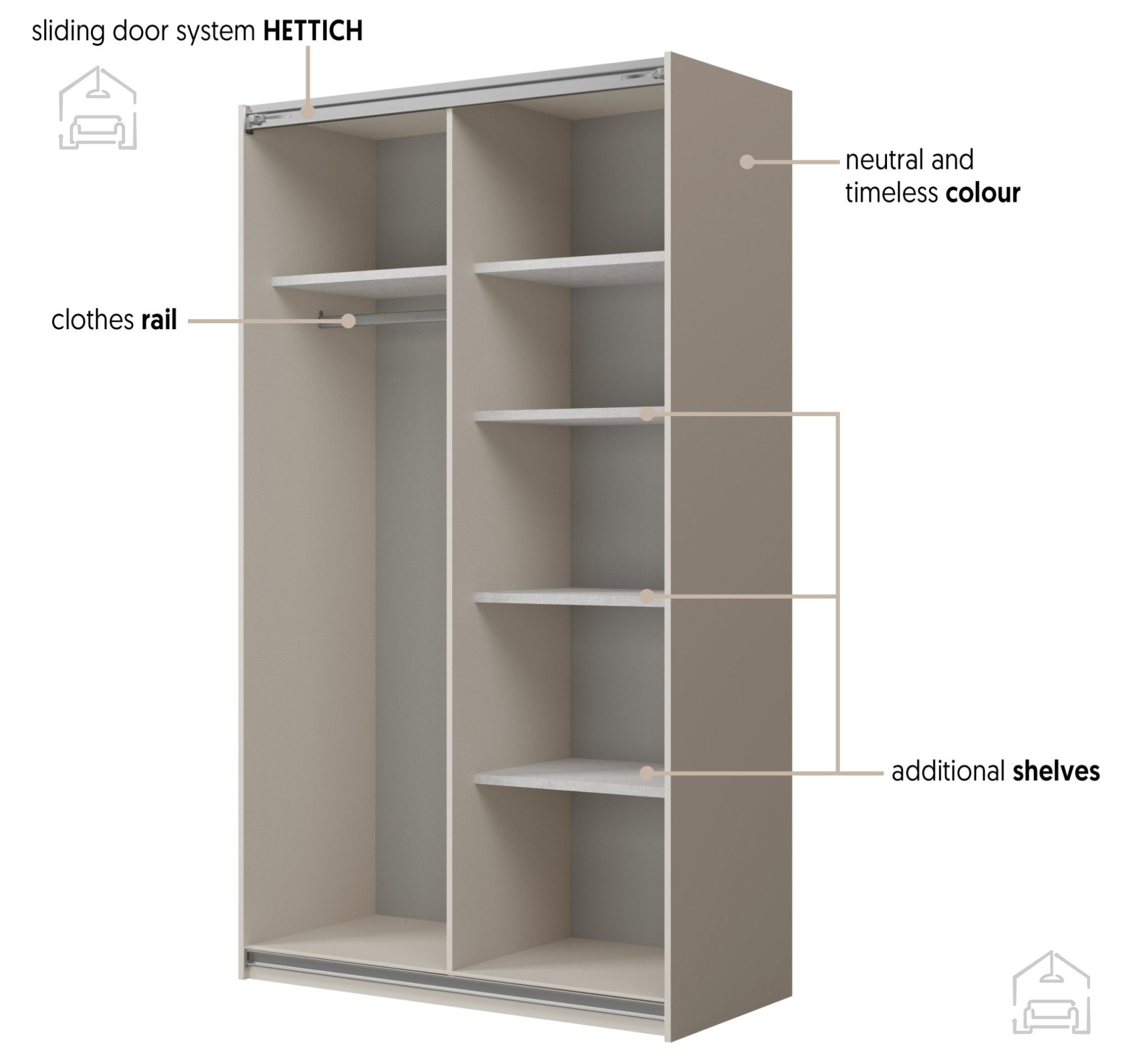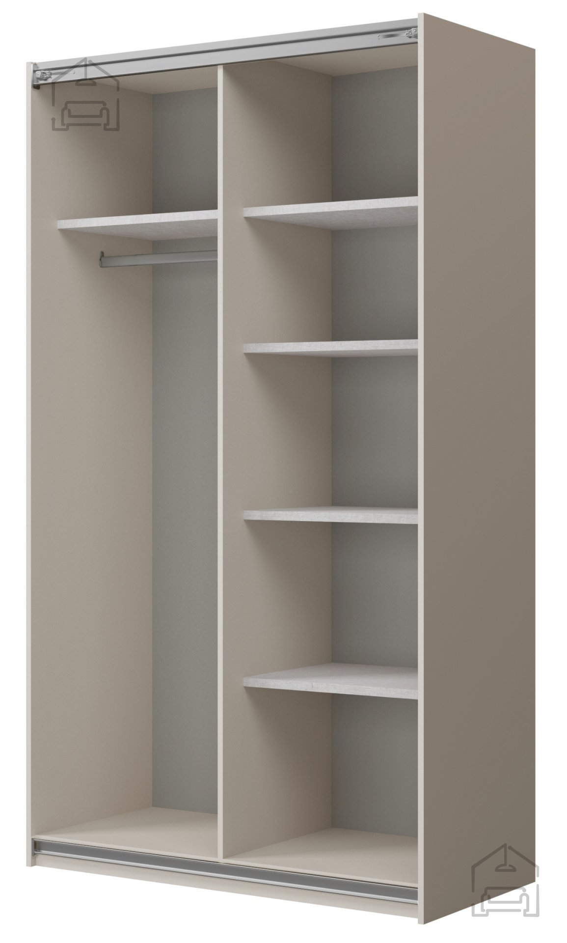 Barva kašmir je nežna, topla in moderna izbira, ki se odlično ujema z različnimi slogovnimi pristopi v notranjem oblikovanju – od minimalističnih do klasičnih. Nevtralni ton omogoča enostavno kombiniranje z drugimi pohištvenimi elementi in barvami sten. Elegantne linije in preprosta oblika poudarjata sodoben značaj omare, medtem ko drsna vrata prispevajo k čisti, urejeni estetiki brez nepotrebnih ročajev ali izboklin.