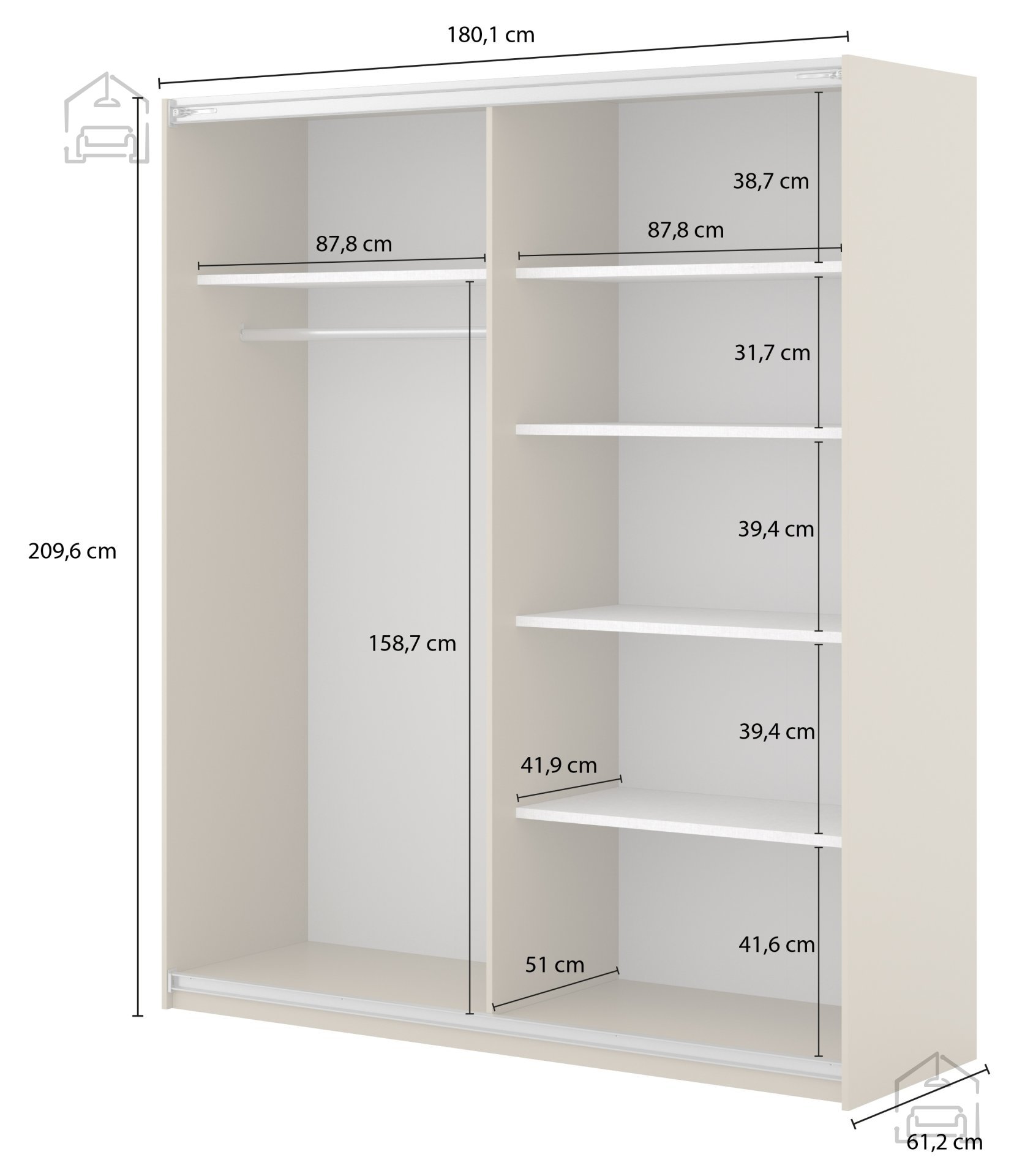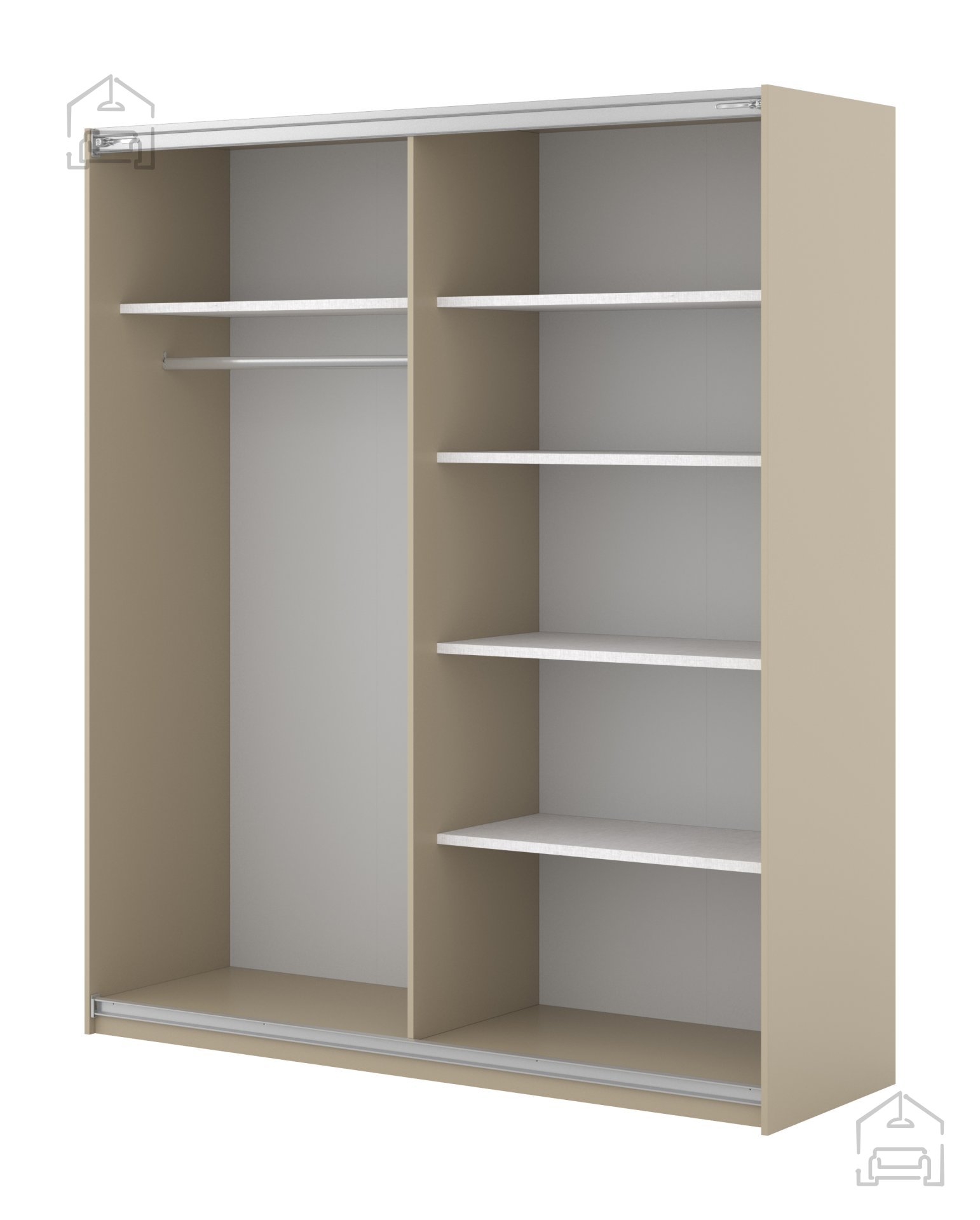 Garderobna omara z drsnimi vrati Niva 180 – Helvetia Meble v nežnem bež odtenku predstavlja sodobno rešitev za urejeno in pregledno shranjevanje oblačil. Z dimenzijami 180x61x210 cm se odlično prilega različnim spalnicam ali garderobnim prostorom, saj ponuja optimalno razmerje med prostornostjo in eleganco. Njena zasnova z drsnimi vrati omogoča preprosto uporabo tudi v manjših prostorih, kjer klasična krilna vrata morda ne bi bila praktična.