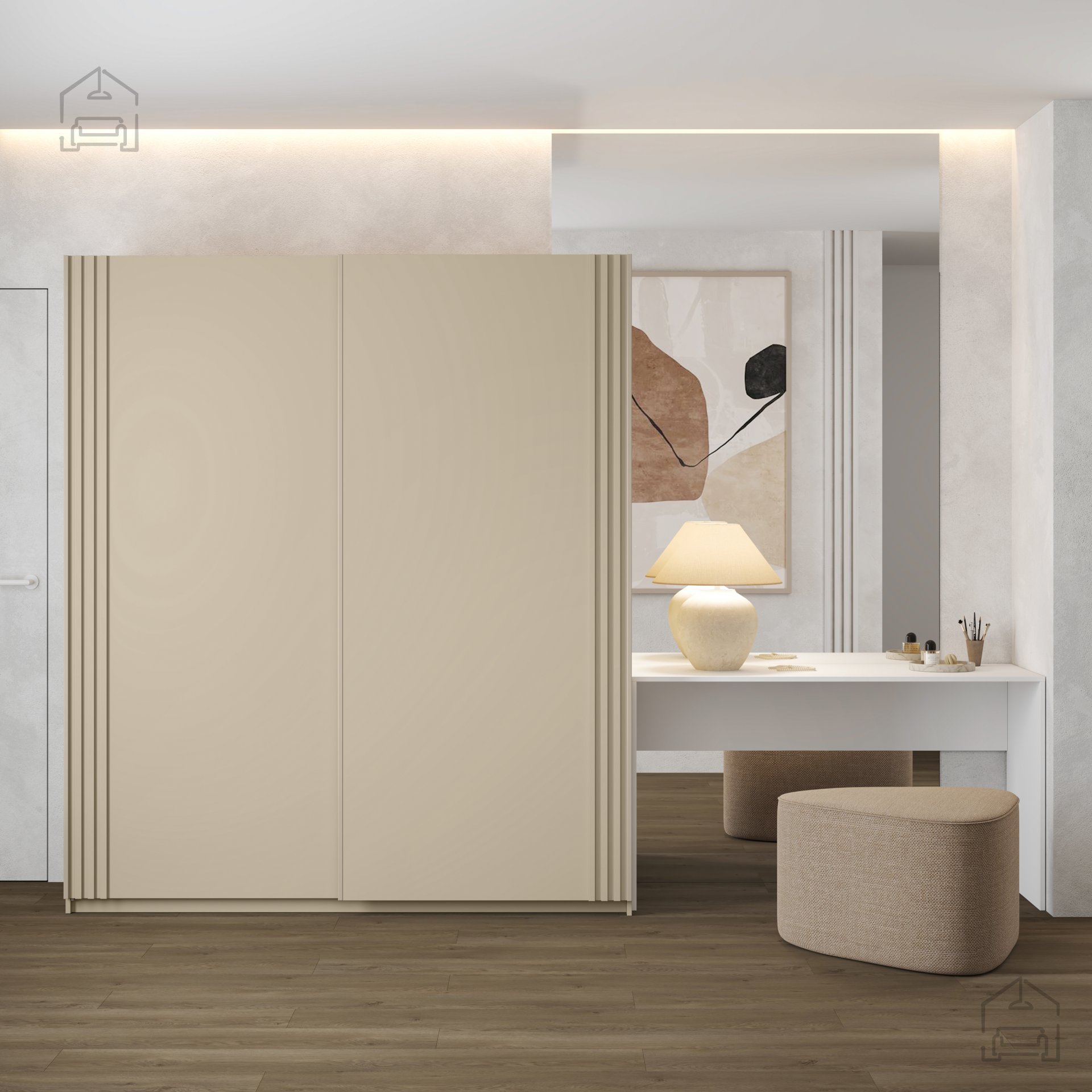 Omara je opremljena z dvema drsnima vratoma, ki se odpirata gladko in tiho. Mehanizem omogoča možnost tihega zapiranja, kar dodatno prispeva k udobju uporabe in preprečuje nepotrebne zvoke pri vsakodnevnem odpiranju. Takšna rešitev je še posebej primerna za spalnice, kjer je tišina ključna za sproščujoče okolje.