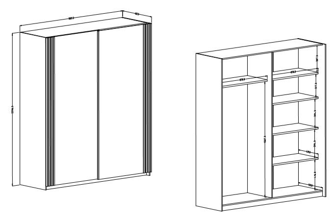 Notranjost omare je zasnovana tako, da omogoča optimalno izrabo prostora. Vključuje praktične police za zložena oblačila in trdno obešalno palico, namenjeno oblačilom, ki jih želite hraniti brez gub. Takšna kombinacija polic in obešalne palice omogoča prilagoditev različnim potrebam uporabnika – od sezonskih oblačil do dodatkov, posteljnine ali torb.